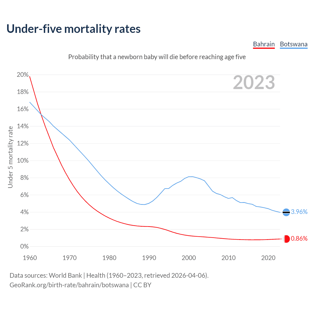 The chance that a newborn baby will die before reaching age five is 0.86% in Bahrain and 3.96% in Botswana. Above is a chart with historical data on under-five mortality rates.