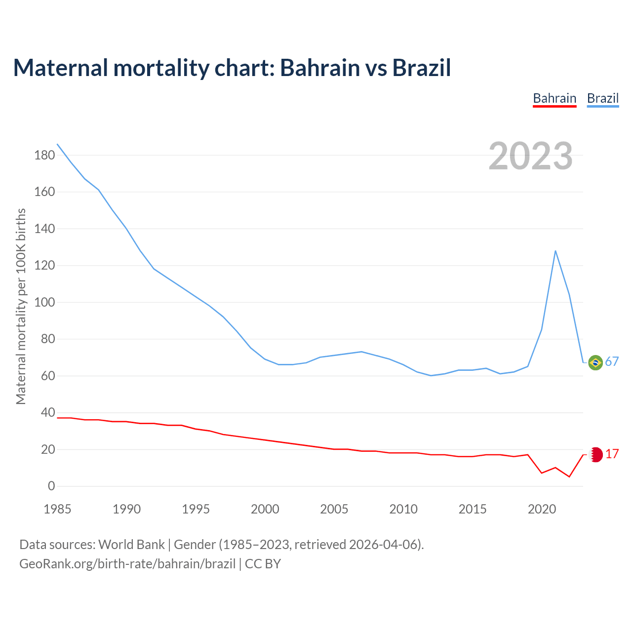 The maternal mortality rate, which is the probability of dying during childbirth or within 42 days of pregnancy termination, is 17 deaths per 100,000 live births in Bahrain, compared to 67 deaths in Brazil.