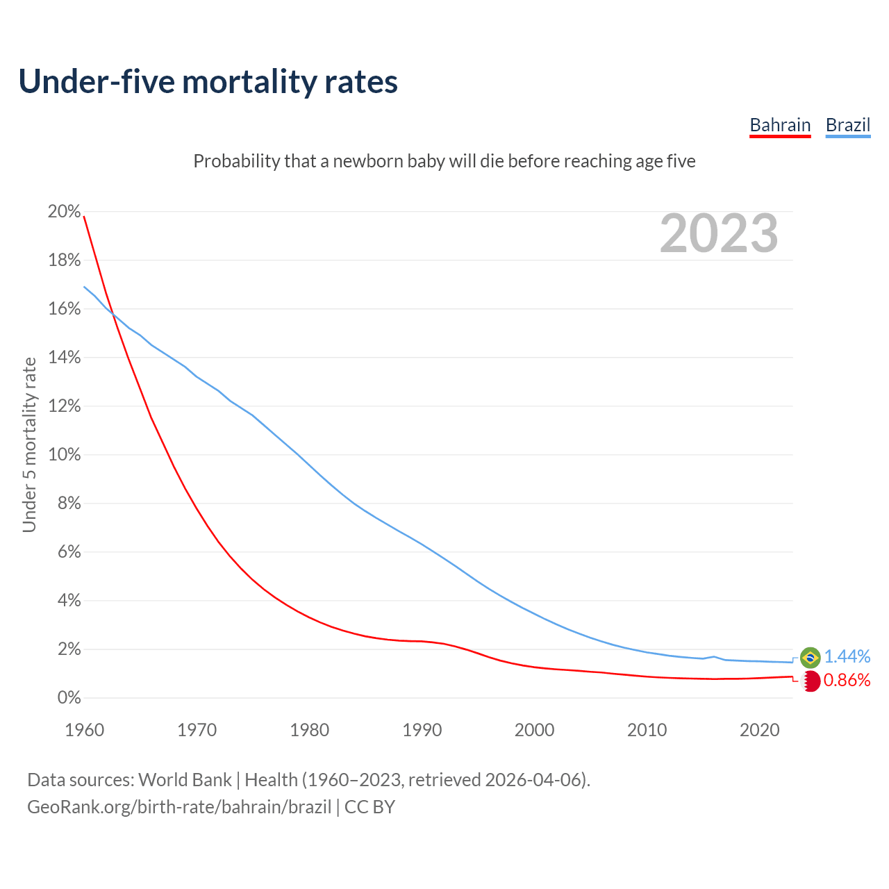 The chance that a newborn baby will die before reaching age five is 0.86% in Bahrain and 1.44% in Brazil. Above is a chart with historical data on under-five mortality rates.
