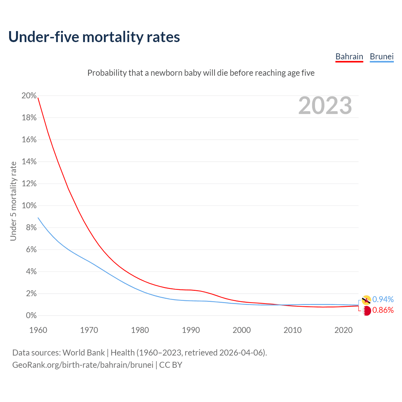 The chance that a newborn baby will die before reaching age five is 0.86% in Bahrain and 0.94% in Brunei. Above is a chart with historical data on under-five mortality rates.