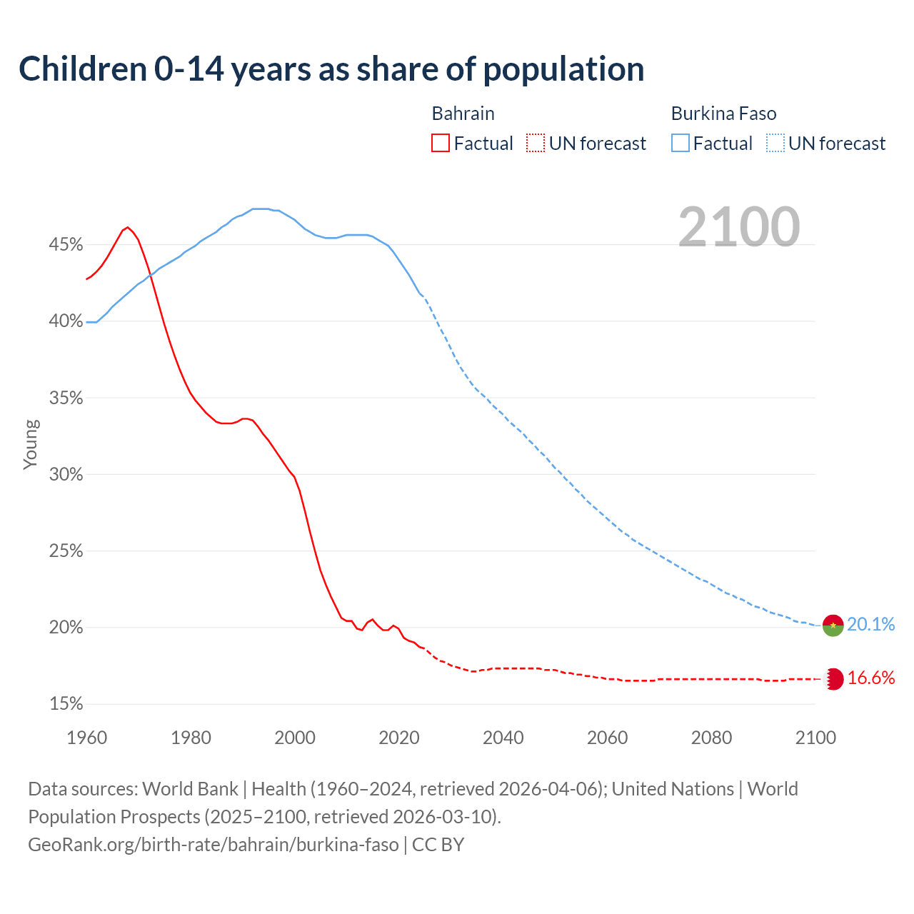 Bahrain has an annual birth rate of 12.5 births per 1,000 people, compared to 31.6 for Burkina Faso. The average number of children a woman is expected to have during her lifetime — the fertility rate, is 1.82 in Bahrain and 4.19 in Burkina Faso — 129.5% difference.