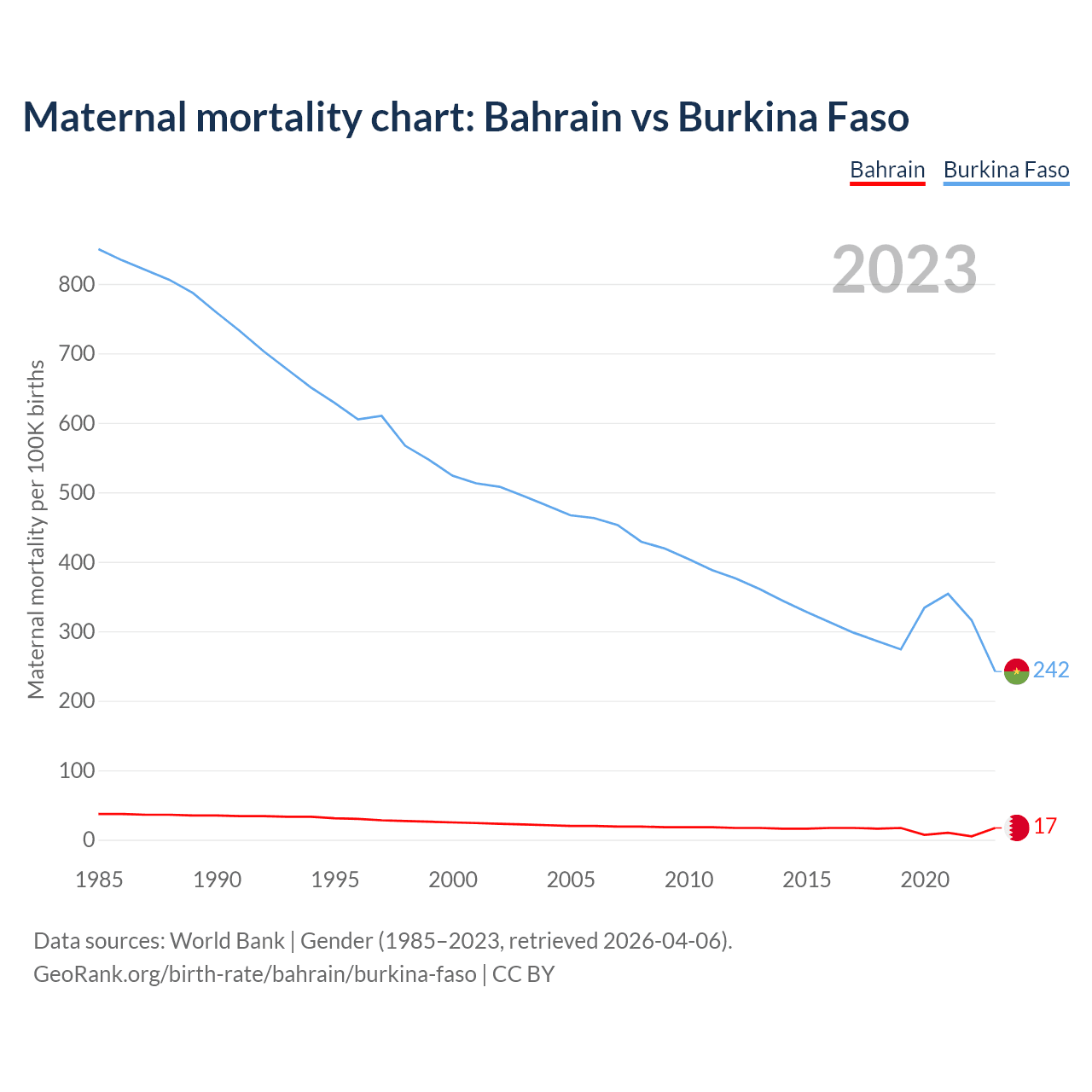 The maternal mortality rate, which is the probability of dying during childbirth or within 42 days of pregnancy termination, is 17 deaths per 100,000 live births in Bahrain, compared to 242 deaths in Burkina Faso.