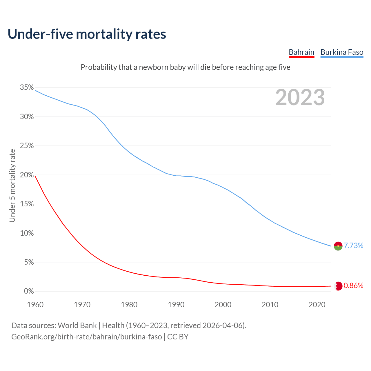 The chance that a newborn baby will die before reaching age five is 0.86% in Bahrain and 7.73% in Burkina Faso. Above is a chart with historical data on under-five mortality rates.