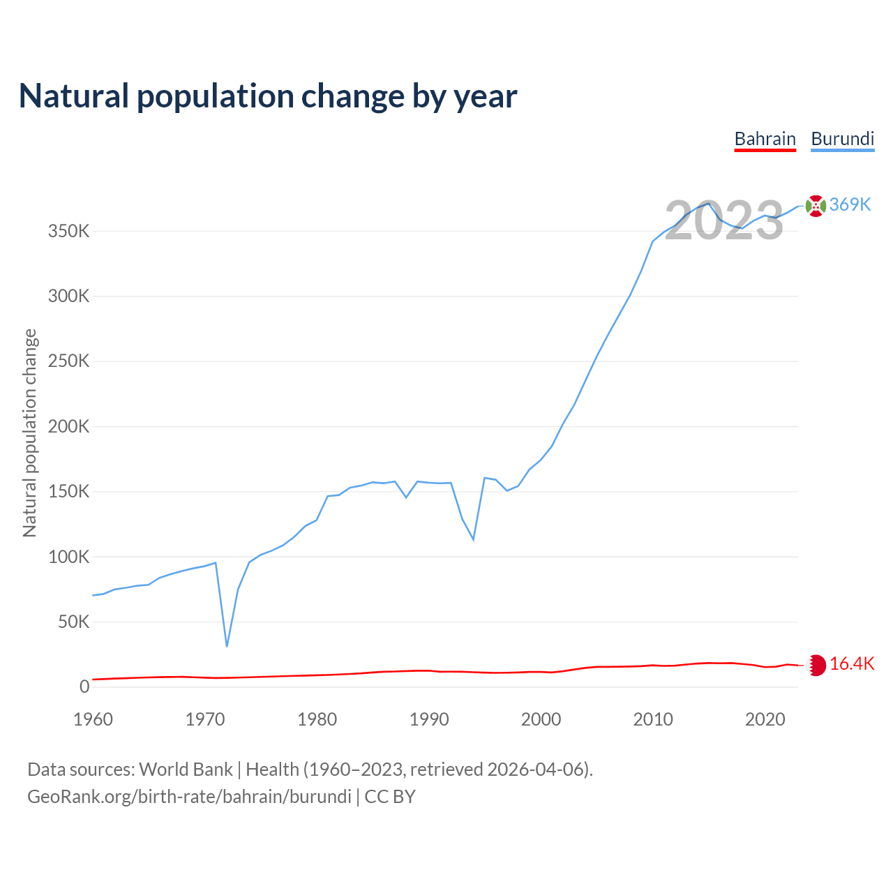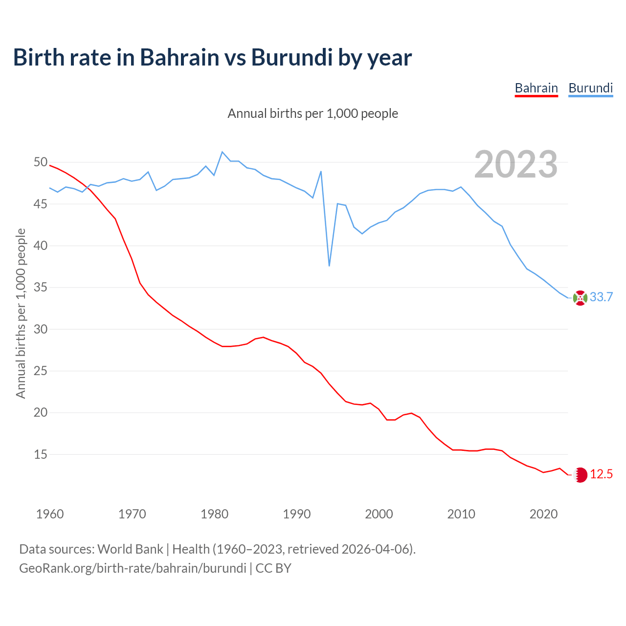 Bahrain has an annual birth rate of 12.5 births per 1,000 people, compared to 33.7 for Burundi. The average number of children a woman is expected to have during her lifetime — the fertility rate, is 1.82 in Bahrain and 4.88 in Burundi — 167.4% difference.