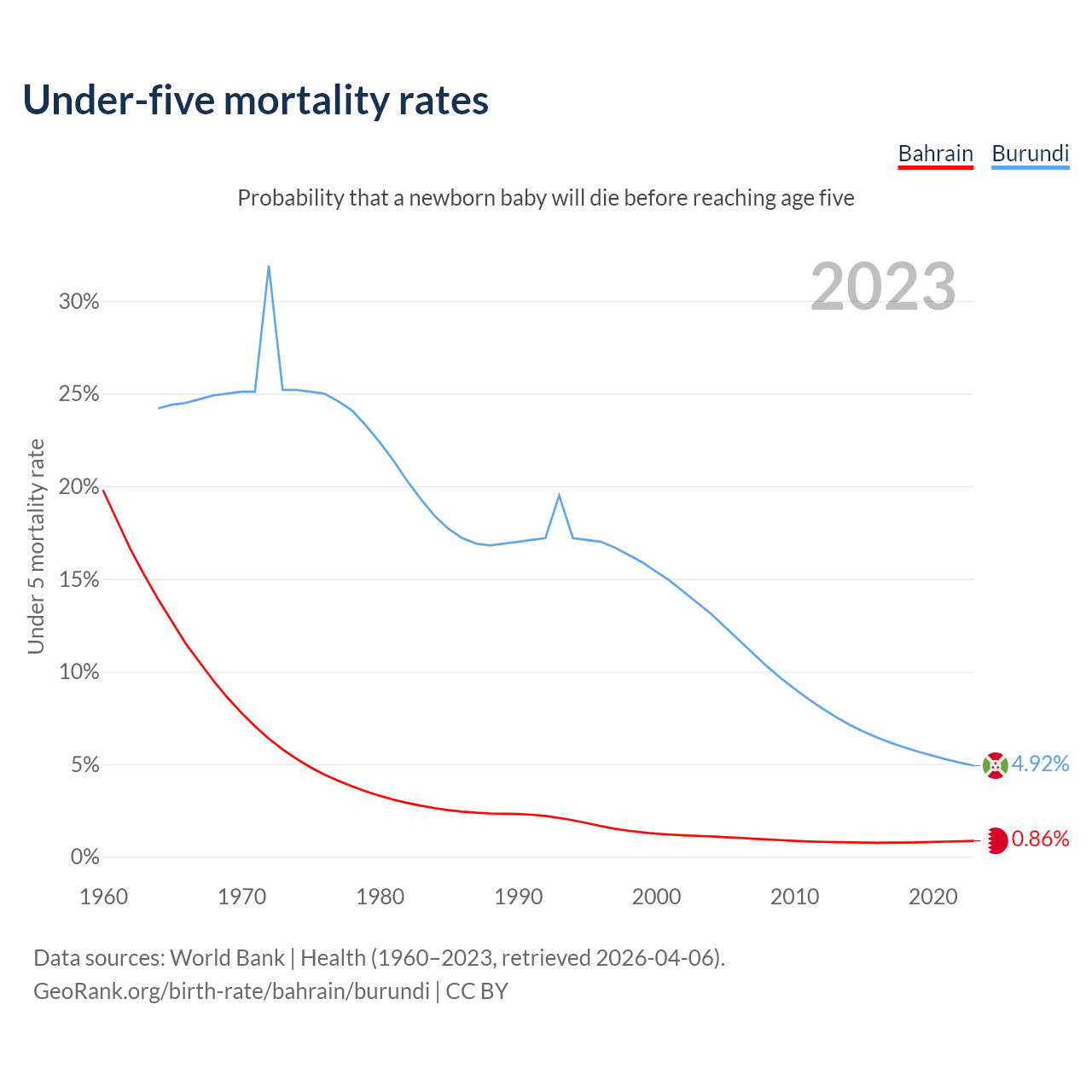 The chance that a newborn baby will die before reaching age five is 0.86% in Bahrain and 4.92% in Burundi. Above is a chart with historical data on under-five mortality rates.