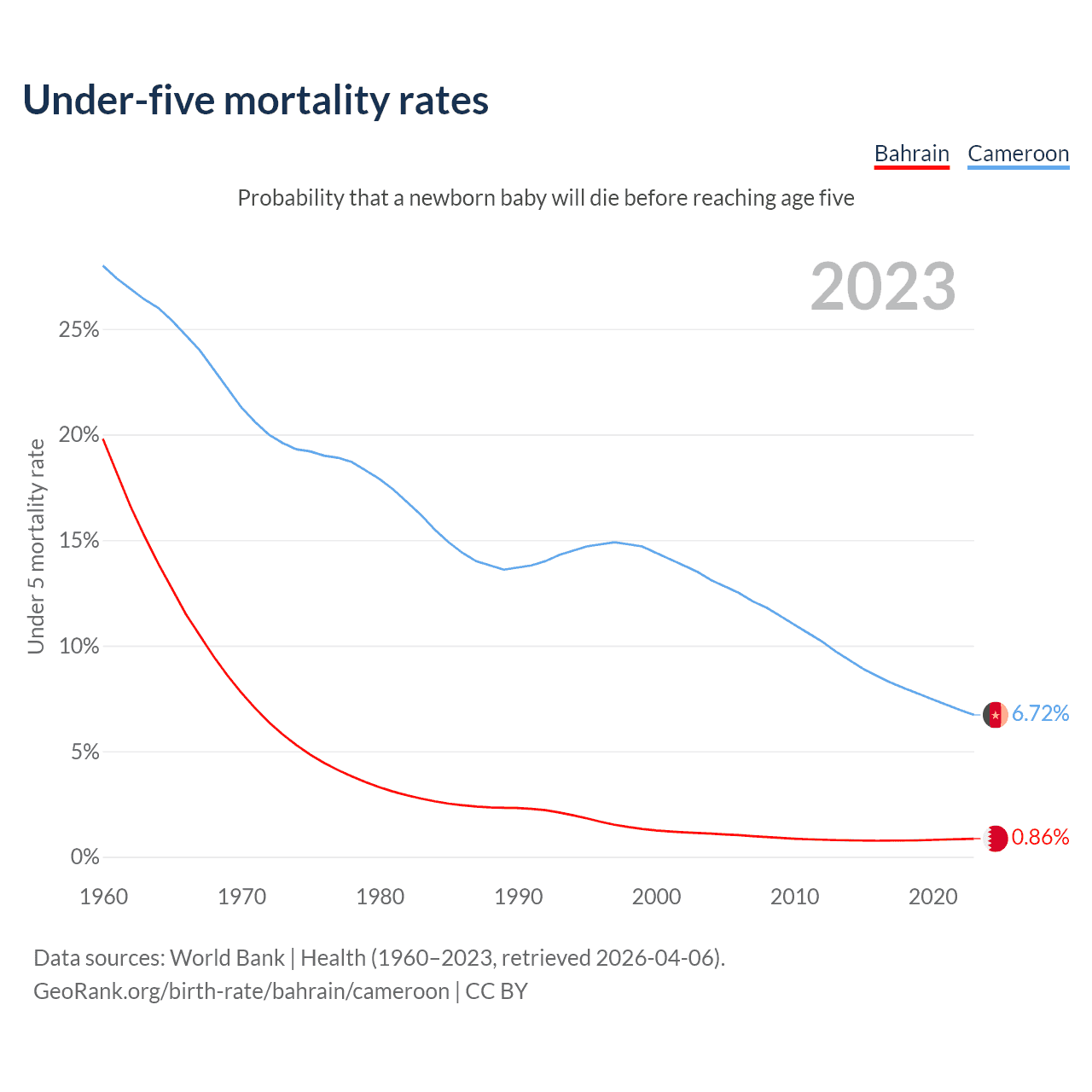The chance that a newborn baby will die before reaching age five is 0.86% in Bahrain and 6.72% in Cameroon. Above is a chart with historical data on under-five mortality rates.
