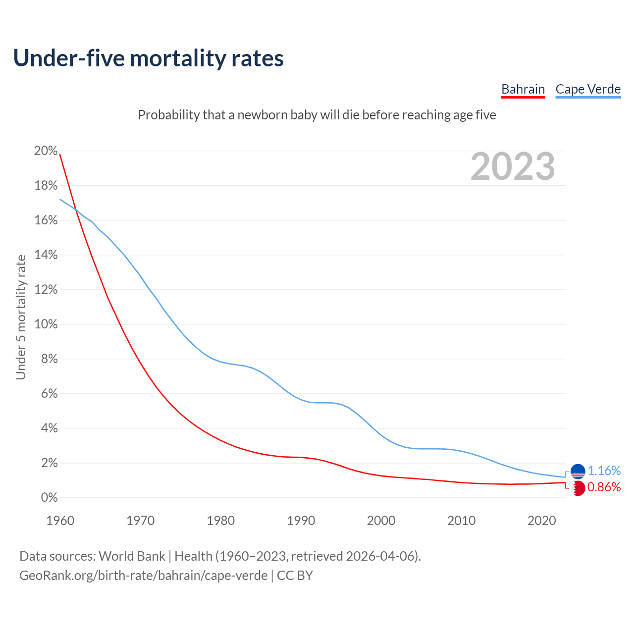 The chance that a newborn baby will die before reaching age five is 0.86% in Bahrain and 1.16% in Cape Verde. Above is a chart with historical data on under-five mortality rates.