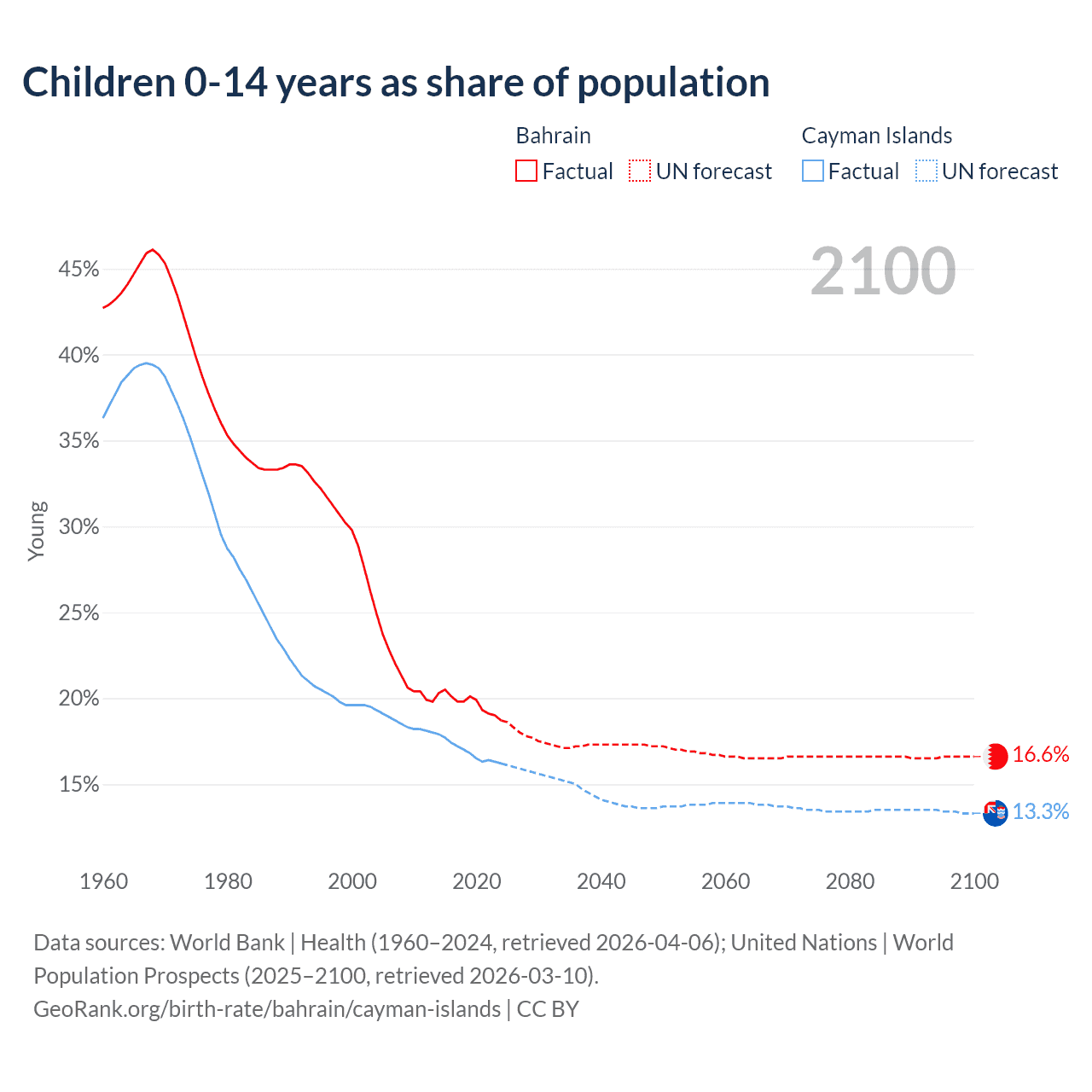 Children aged 0-14 make up 18.7% of the population in Bahrain and 16.2% in the Cayman Islands in 2024, compared to 33.6% and 22.3% respectively in 1990.