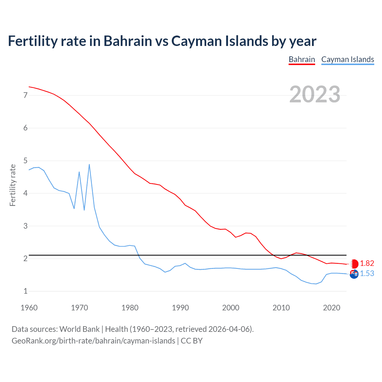 Fertility rate in Bahrain vs Cayman Islands by year