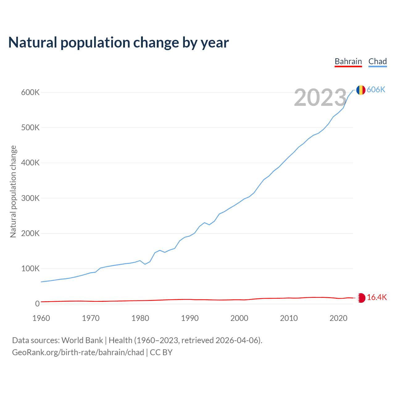 Bahrain has an annual birth rate of 12.5 births per 1,000 people, compared to 42.4 for Chad. The average number of children a woman is expected to have during her lifetime — the fertility rate, is 1.82 in Bahrain and 6.12 in Chad — 235.5% difference.