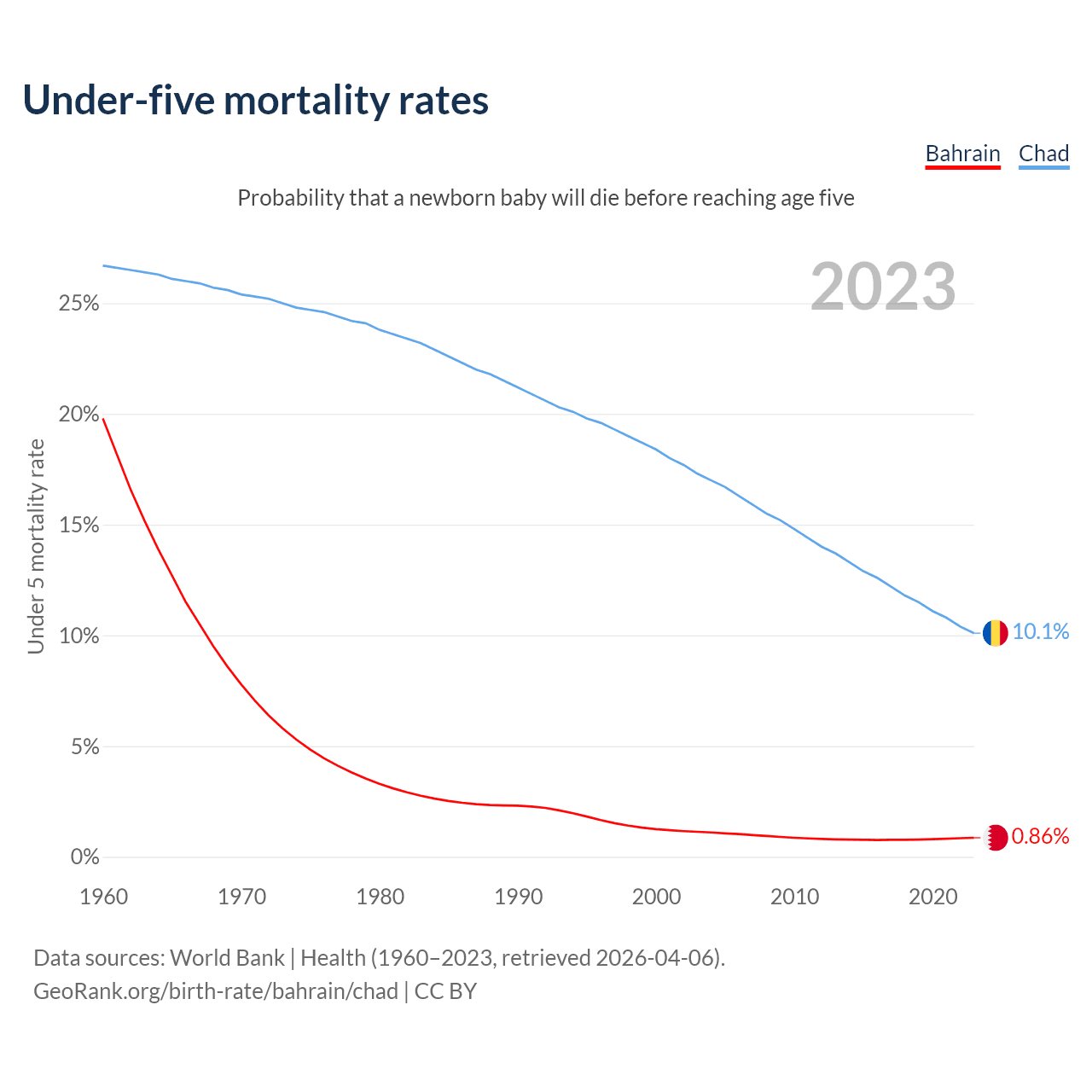 The chance that a newborn baby will die before reaching age five is 0.86% in Bahrain and 10.1% in Chad. Above is a chart with historical data on under-five mortality rates.