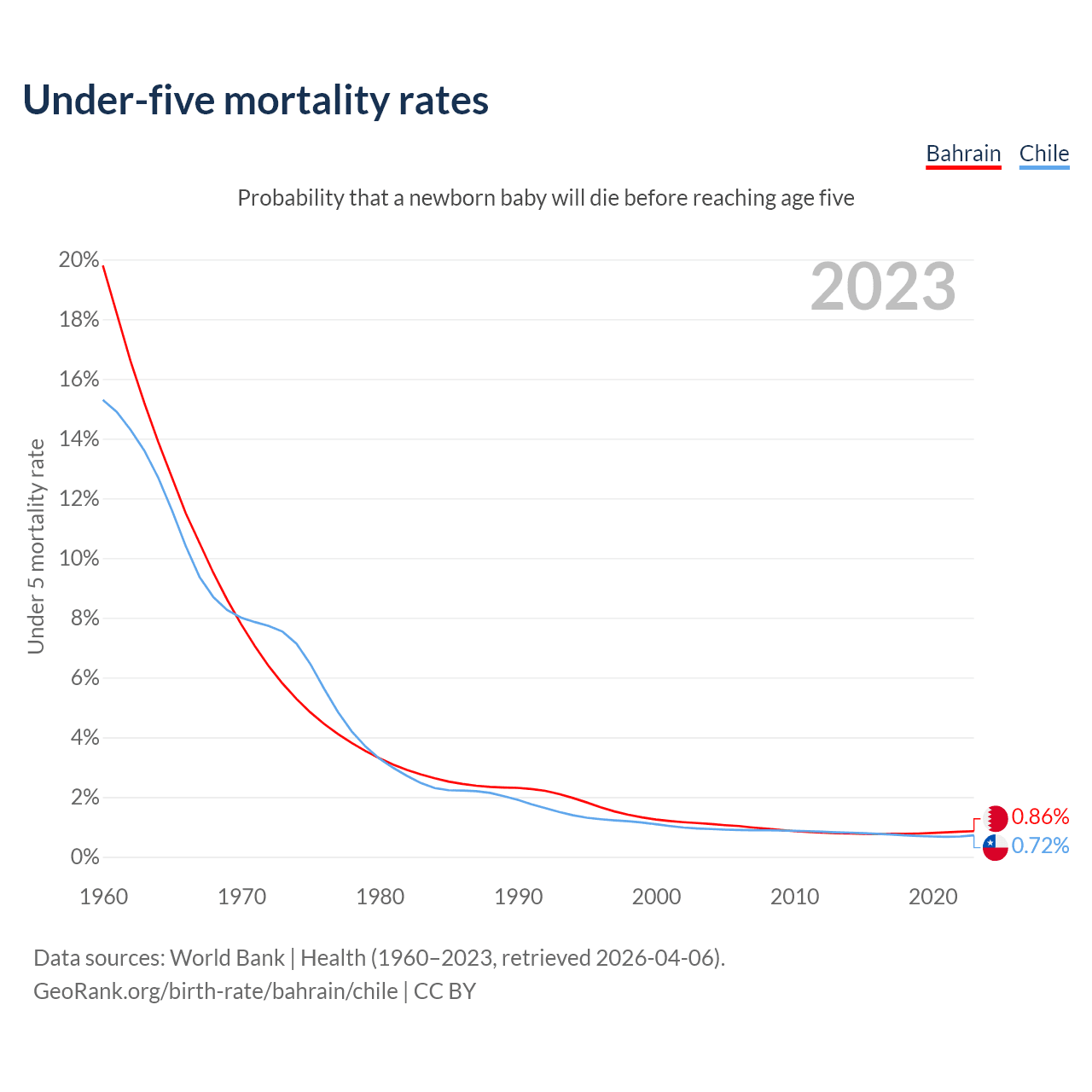 The chance that a newborn baby will die before reaching age five is 0.86% in Bahrain and 0.72% in Chile. Above is a chart with historical data on under-five mortality rates.