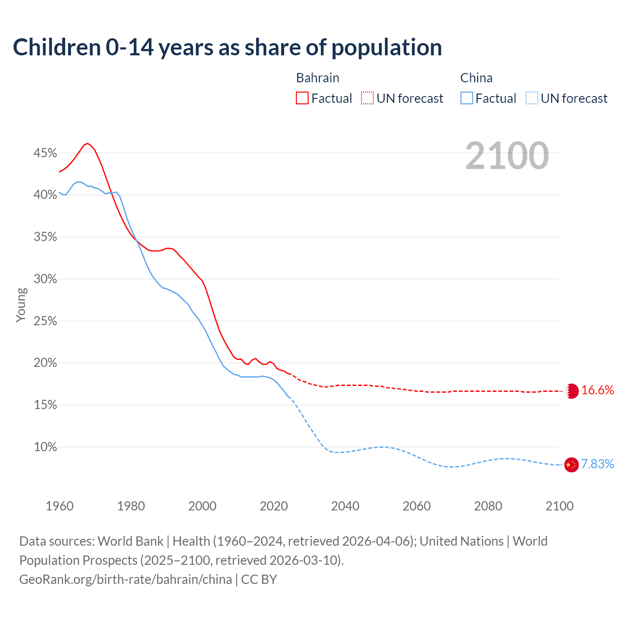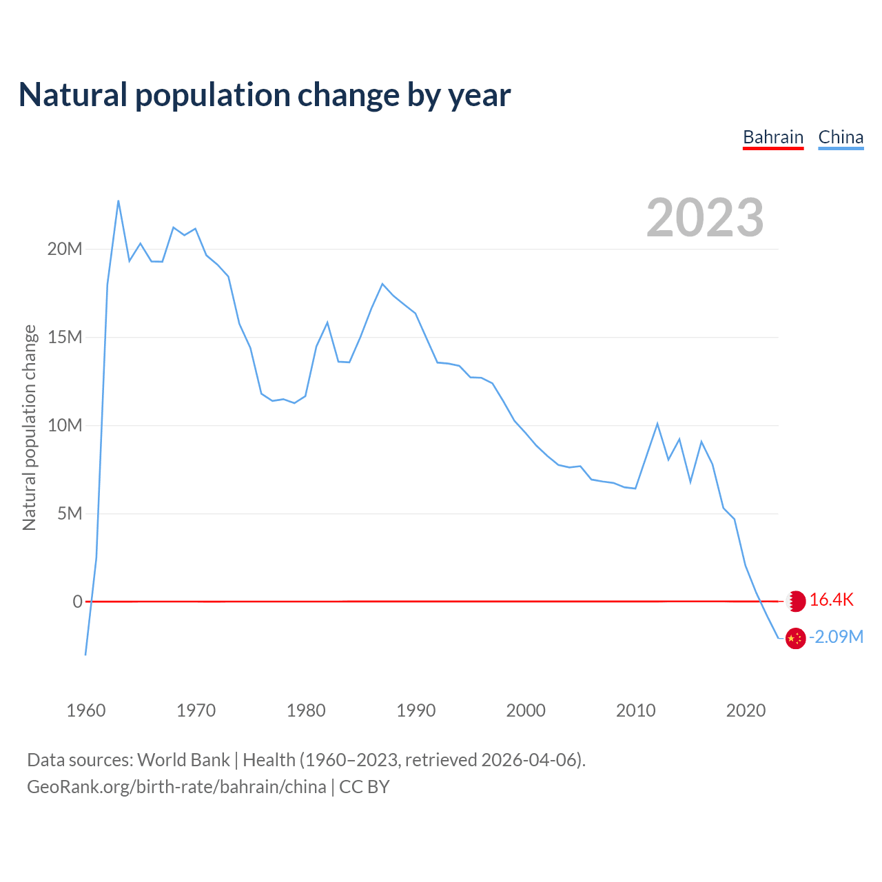 Bahrain has an annual birth rate of 12.5 births per 1,000 people, compared to 6.39 for China. The average number of children a woman is expected to have during her lifetime — the fertility rate, is 1.82 in Bahrain and 1 in China — 45.2% difference.