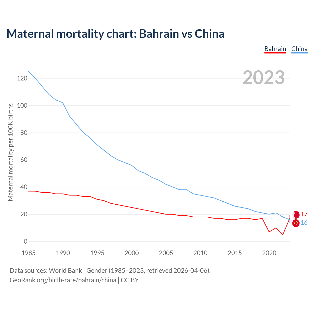 The maternal mortality rate, which is the probability of dying during childbirth or within 42 days of pregnancy termination, is 17 deaths per 100,000 live births in Bahrain, compared to 16 deaths in China.