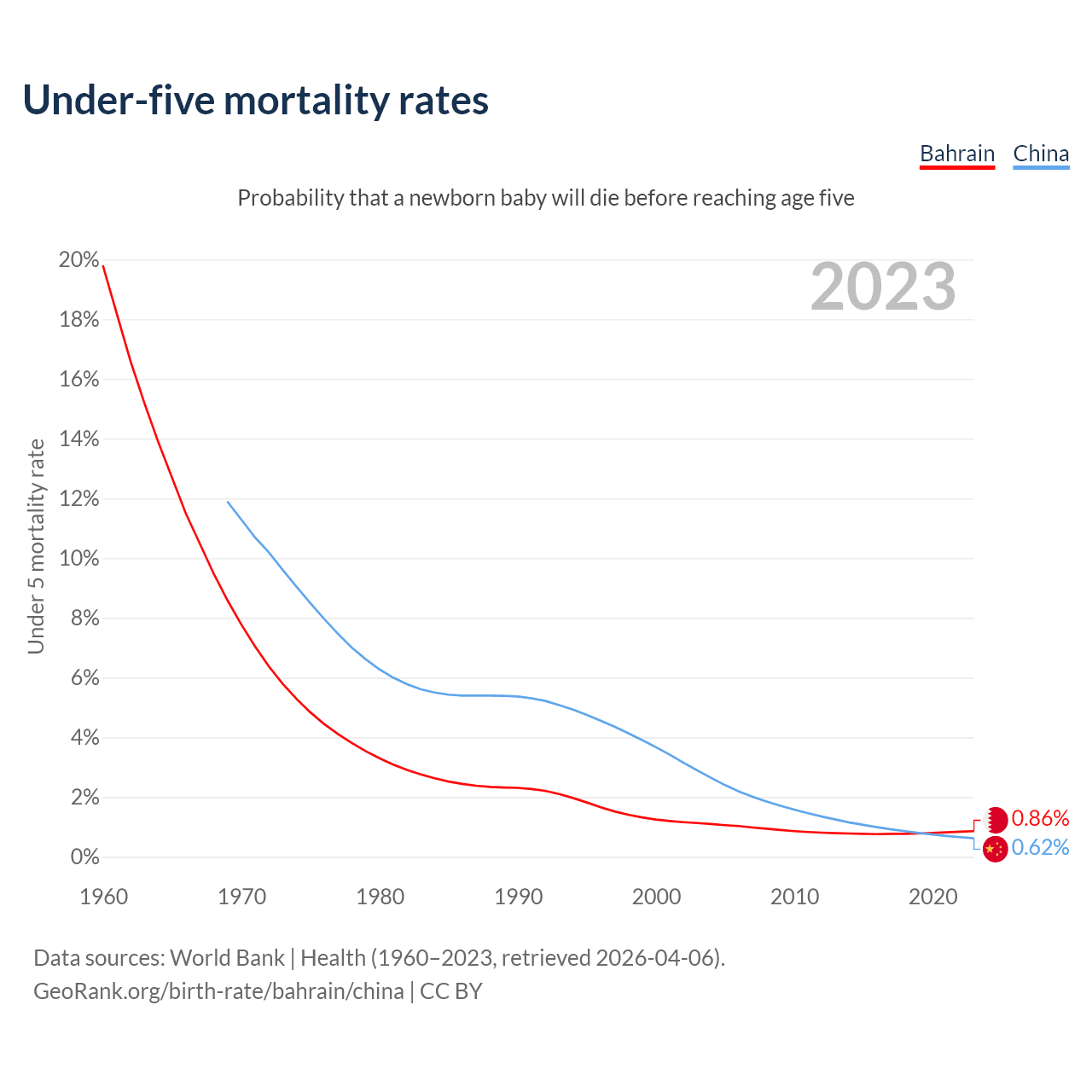 The chance that a newborn baby will die before reaching age five is 0.86% in Bahrain and 0.62% in China. Above is a chart with historical data on under-five mortality rates.
