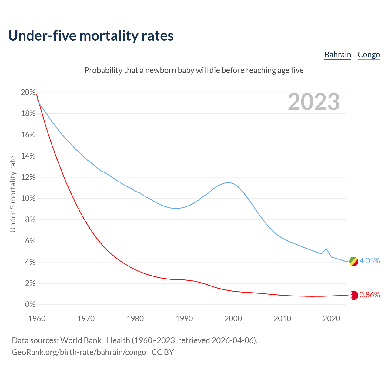 The chance that a newborn baby will die before reaching age five is 0.86% in Bahrain and 4.05% in the Congo. Above is a chart with historical data on under-five mortality rates.