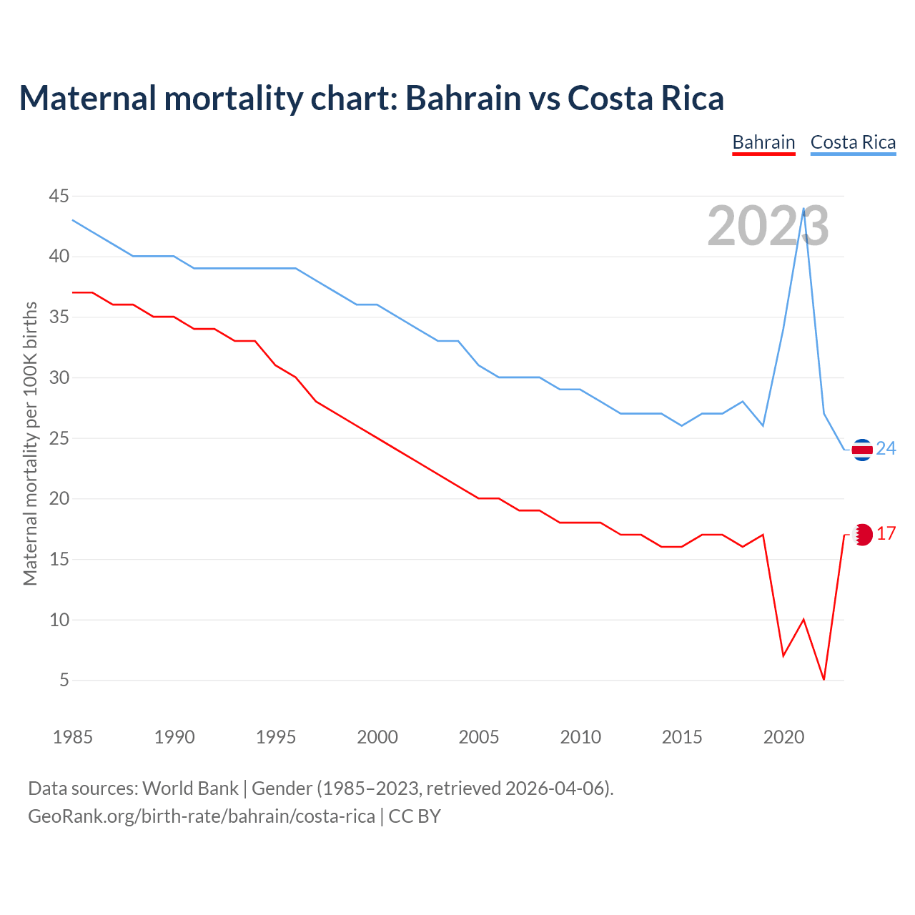 The maternal mortality rate, which is the probability of dying during childbirth or within 42 days of pregnancy termination, is 17 deaths per 100,000 live births in Bahrain, compared to 24 deaths in Costa Rica.