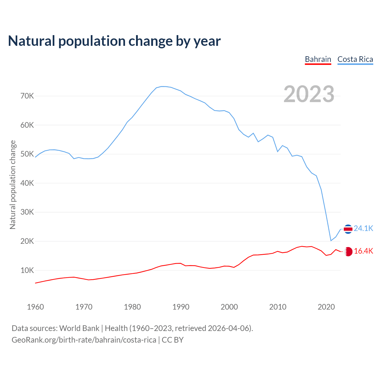Bahrain has an annual birth rate of 12.5 births per 1,000 people, compared to 10.2 for Costa Rica. The average number of children a woman is expected to have during her lifetime — the fertility rate, is 1.82 in Bahrain and 1.33 in Costa Rica — 27.1% difference.