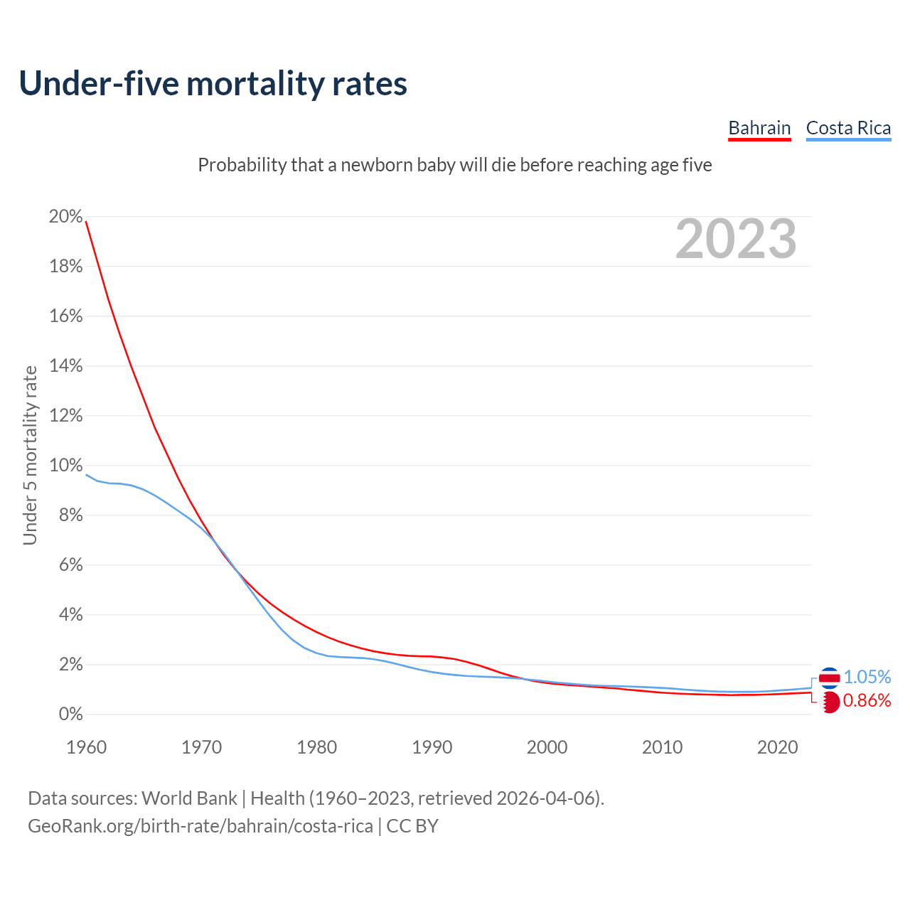 The chance that a newborn baby will die before reaching age five is 0.86% in Bahrain and 1.05% in Costa Rica. Above is a chart with historical data on under-five mortality rates.