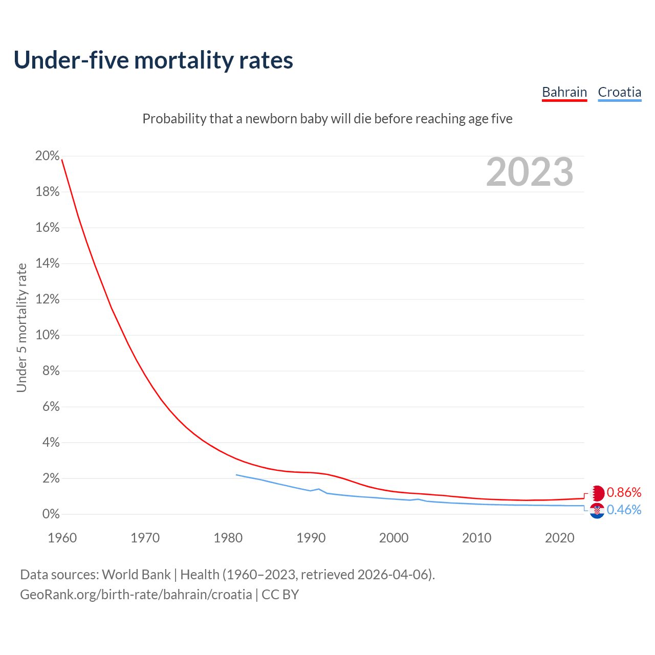 The chance that a newborn baby will die before reaching age five is 0.86% in Bahrain and 0.46% in Croatia. Above is a chart with historical data on under-five mortality rates.
