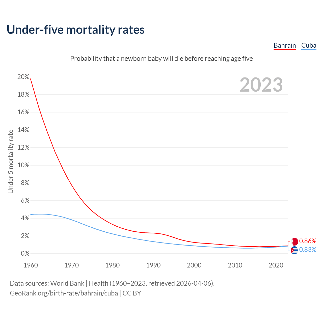 The chance that a newborn baby will die before reaching age five is 0.86% in Bahrain and 0.83% in Cuba. Above is a chart with historical data on under-five mortality rates.