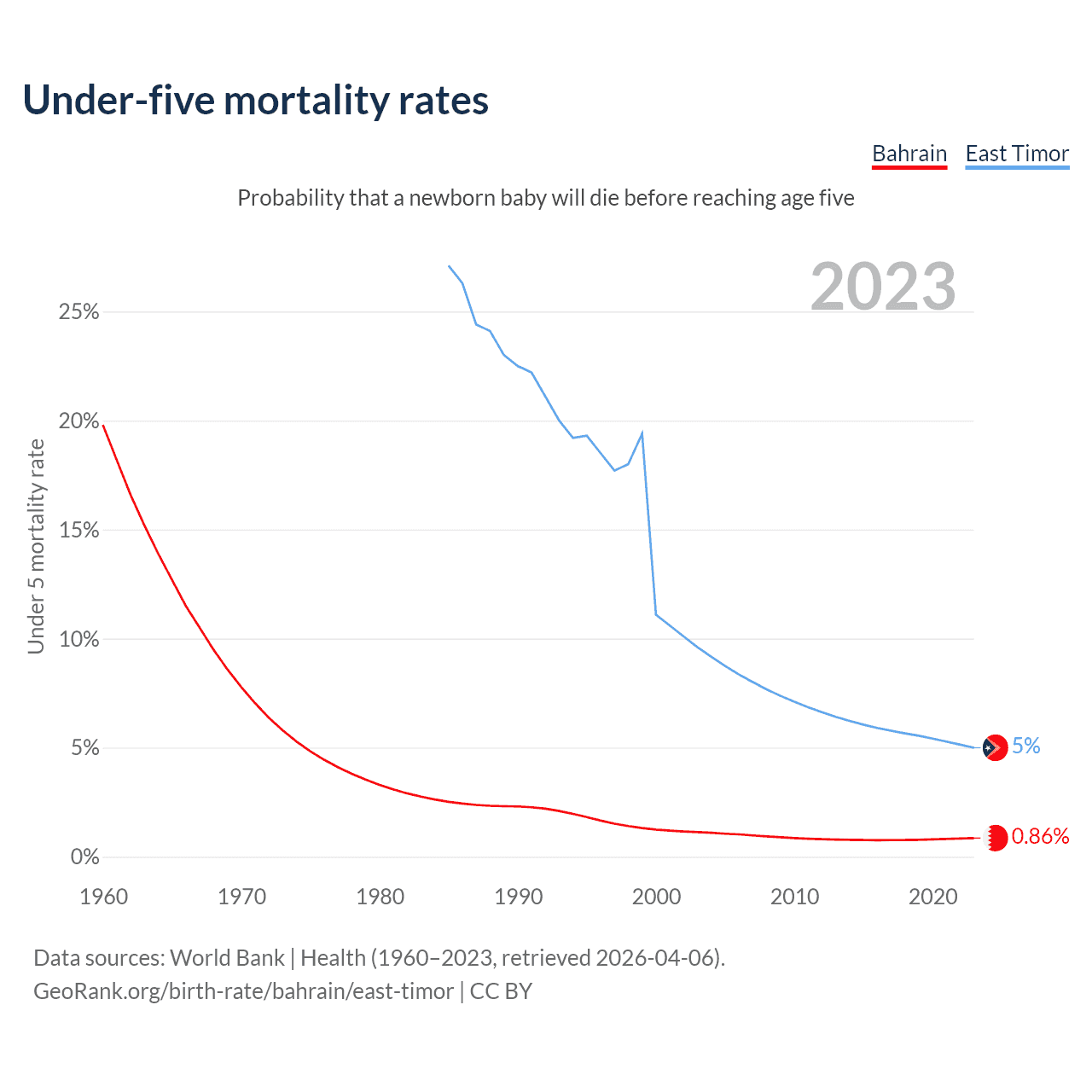 The chance that a newborn baby will die before reaching age five is 0.86% in Bahrain and 5% in East Timor. Above is a chart with historical data on under-five mortality rates.