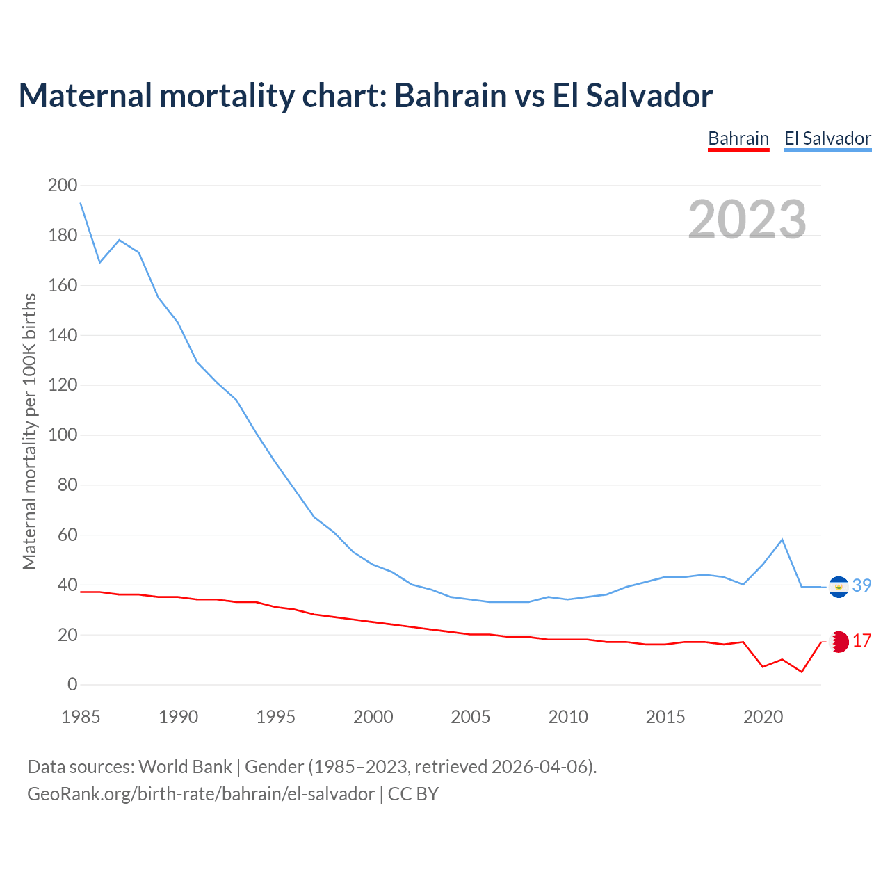 The maternal mortality rate, which is the probability of dying during childbirth or within 42 days of pregnancy termination, is 17 deaths per 100,000 live births in Bahrain, compared to 39 deaths in El Salvador.