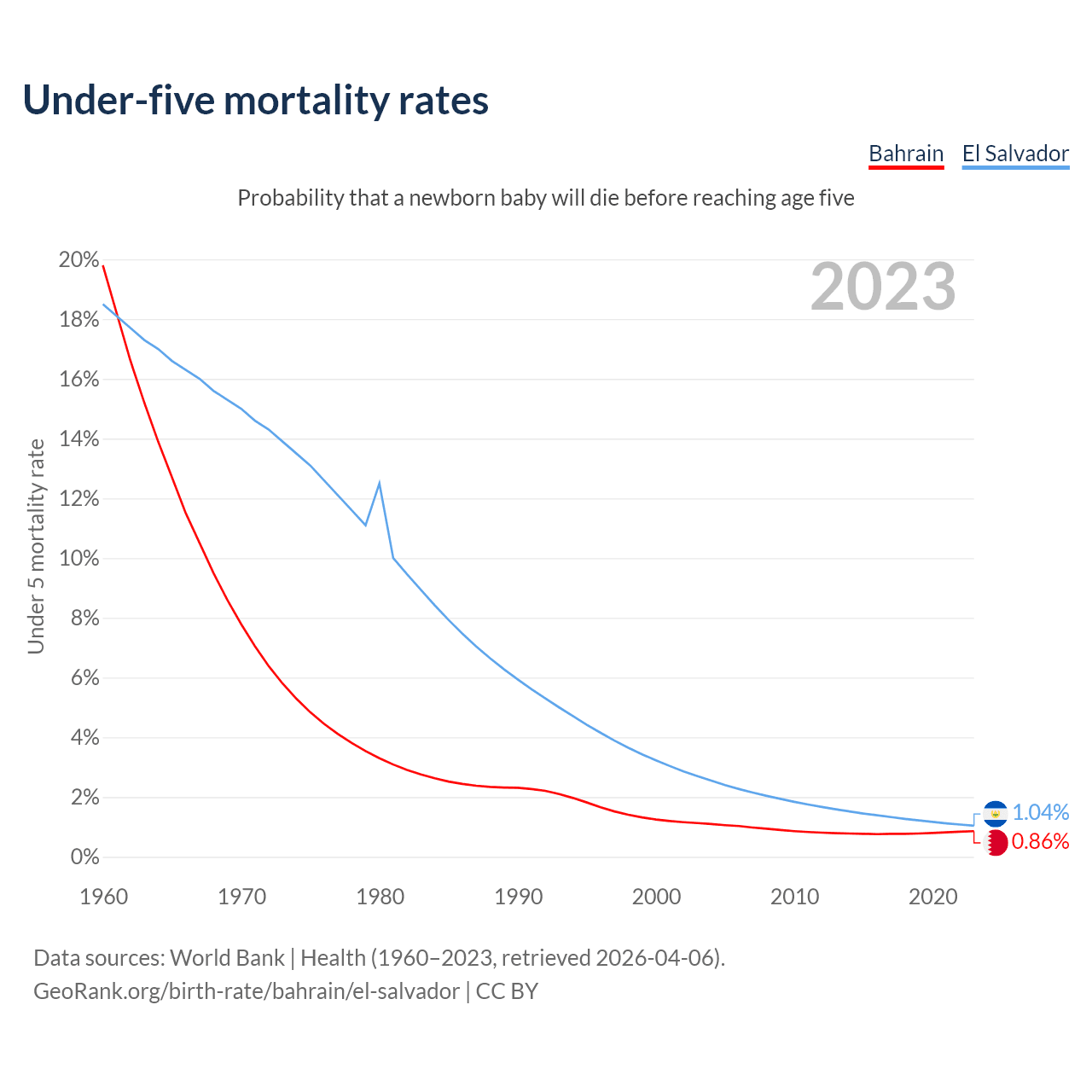 The chance that a newborn baby will die before reaching age five is 0.86% in Bahrain and 1.04% in El Salvador. Above is a chart with historical data on under-five mortality rates.