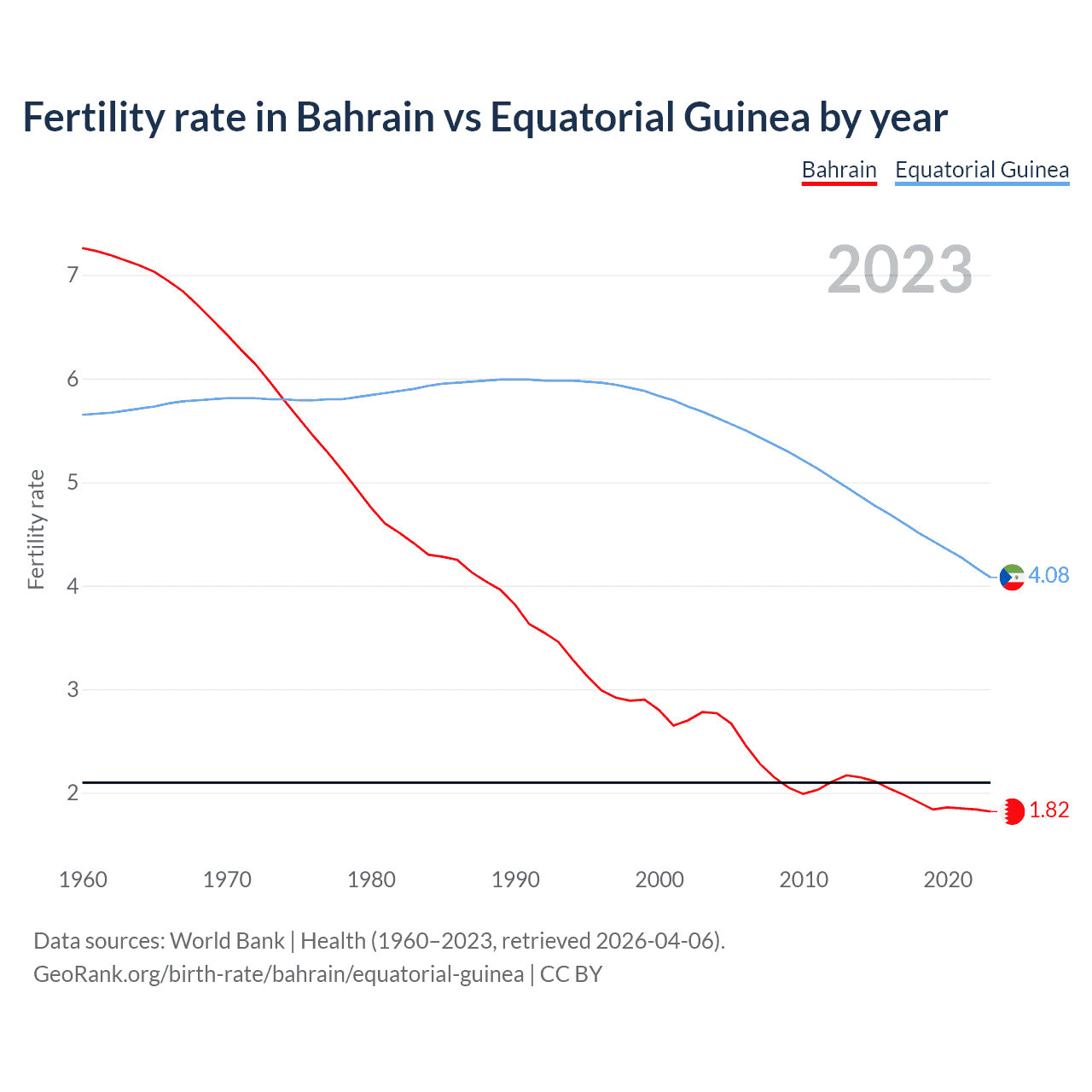1960 vs 2023, the fertility rate has decreased by 74.9% in Bahrain and by 27.8% in Equatorial Guinea — in 1960, it was 7.26 and 5.65, respectively.