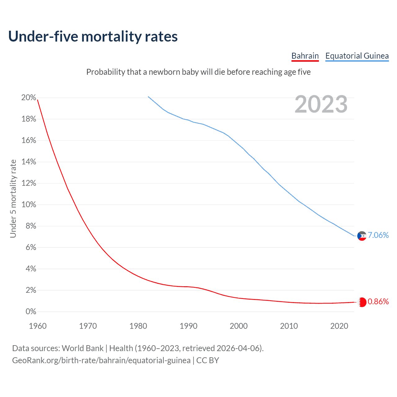 The chance that a newborn baby will die before reaching age five is 0.86% in Bahrain and 7.06% in Equatorial Guinea. Above is a chart with historical data on under-five mortality rates.