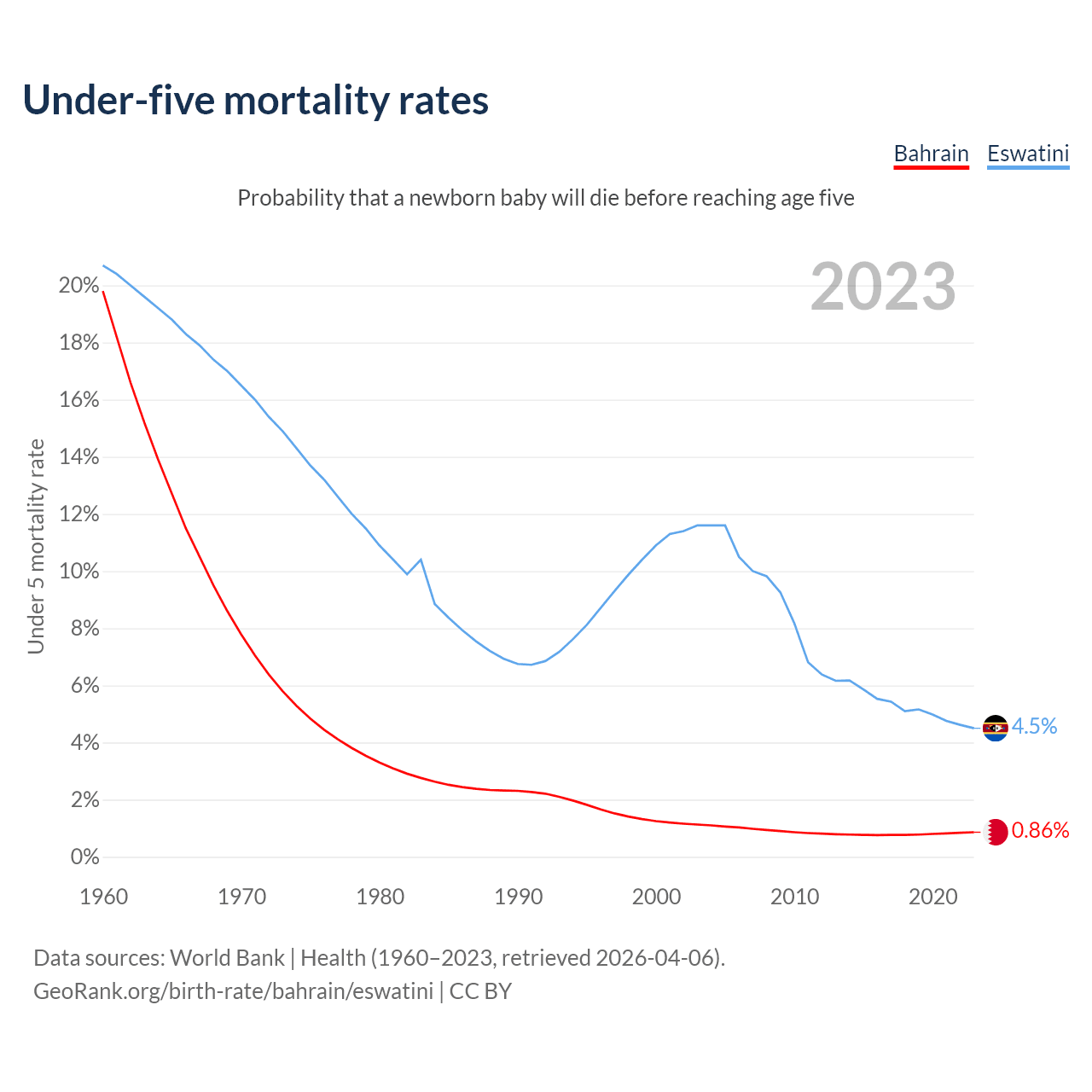 The chance that a newborn baby will die before reaching age five is 0.86% in Bahrain and 4.5% in Eswatini. Above is a chart with historical data on under-five mortality rates.