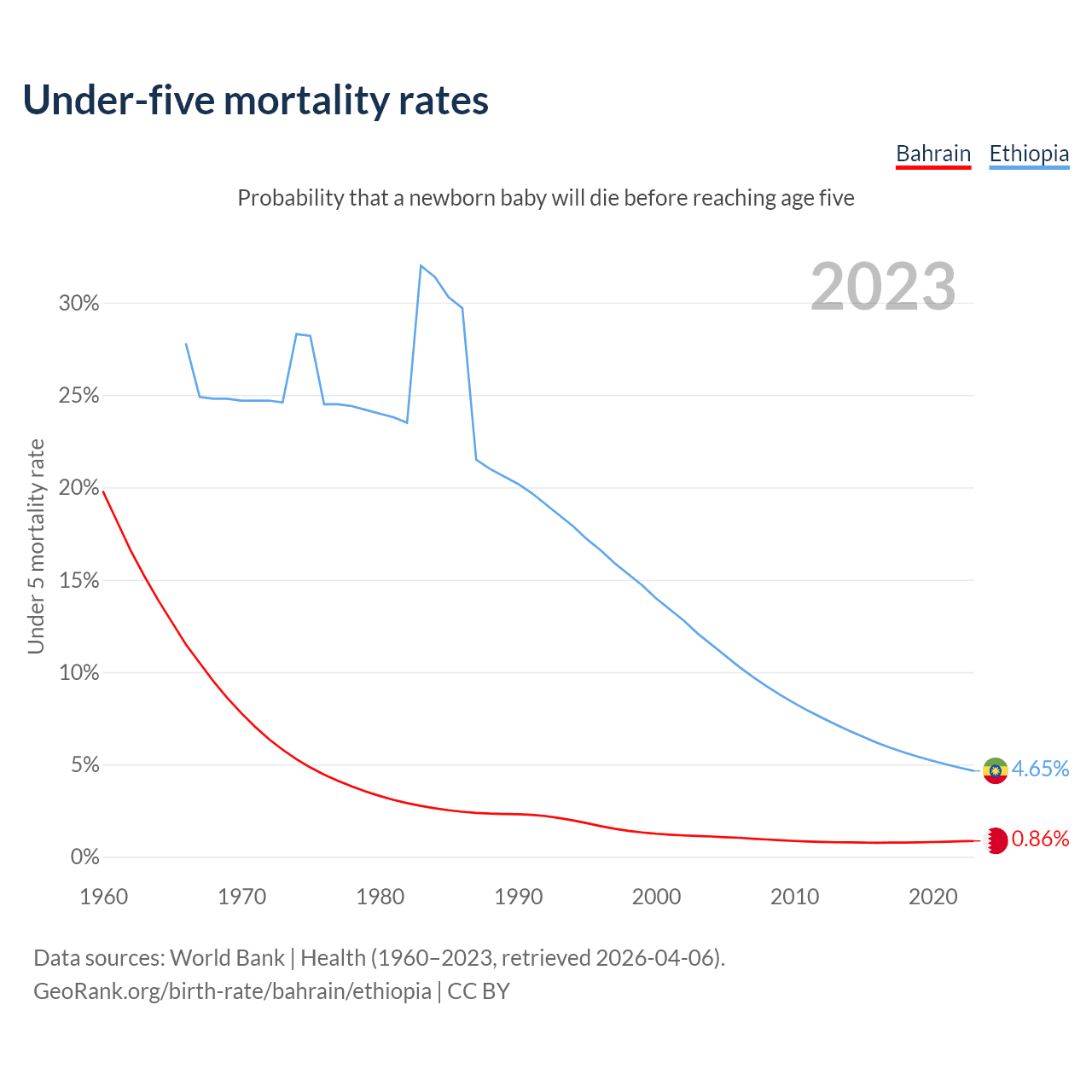 The chance that a newborn baby will die before reaching age five is 0.86% in Bahrain and 4.65% in Ethiopia. Above is a chart with historical data on under-five mortality rates.