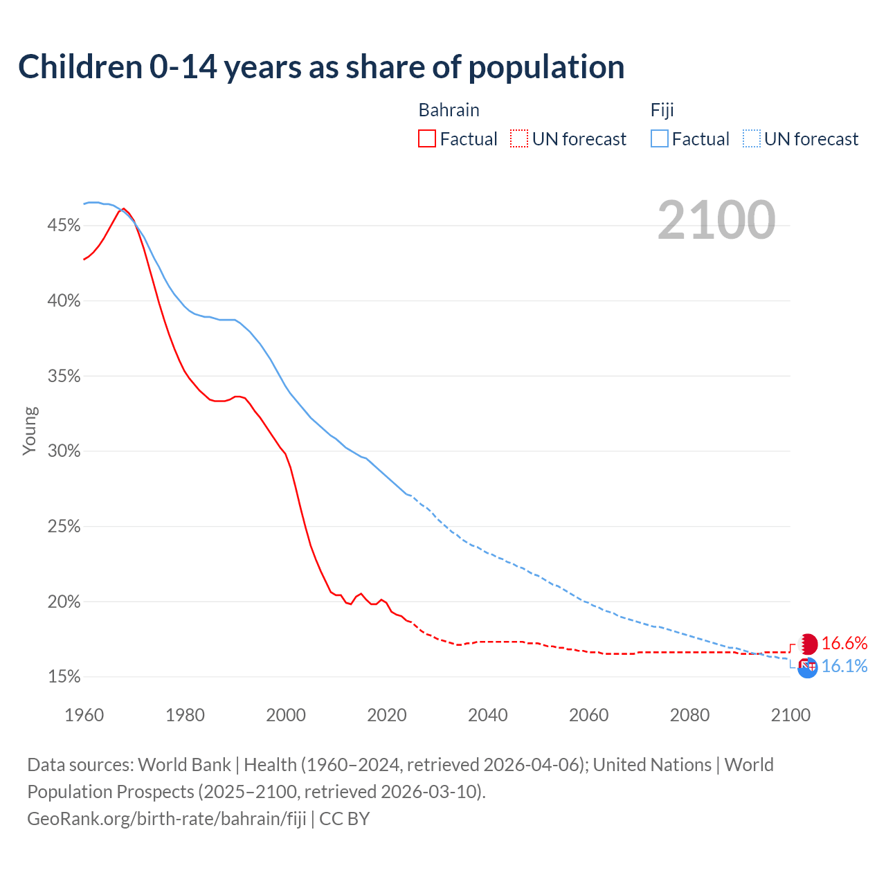 According to the latest available data on birth rates, the fertility rate in Bahrain was 1.82 children per woman in 2023, compared to 2.28 in Fiji in 2023. The replacement level is considered to be 2.1 children per woman.