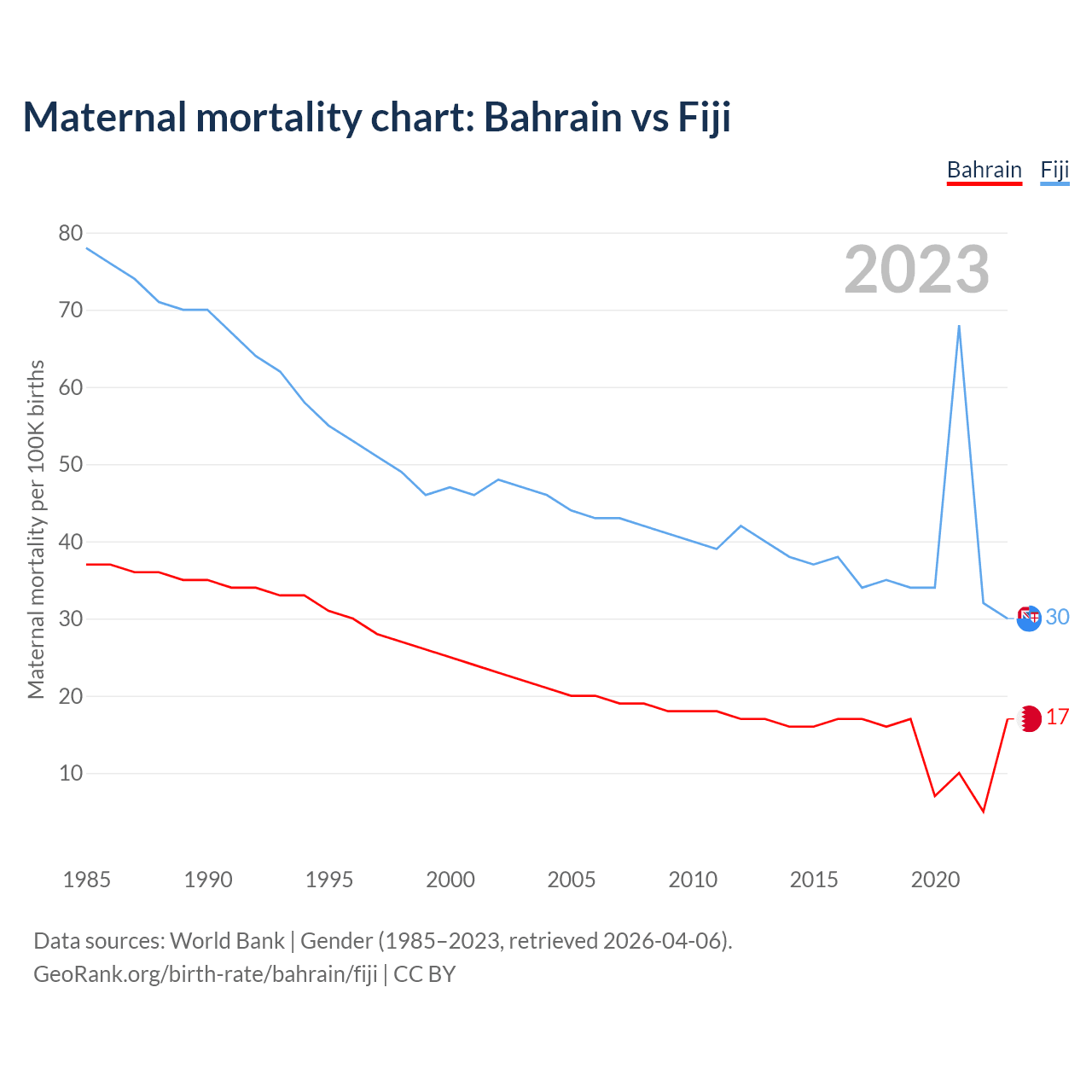 The maternal mortality rate, which is the probability of dying during childbirth or within 42 days of pregnancy termination, is 17 deaths per 100,000 live births in Bahrain, compared to 30 deaths in Fiji.