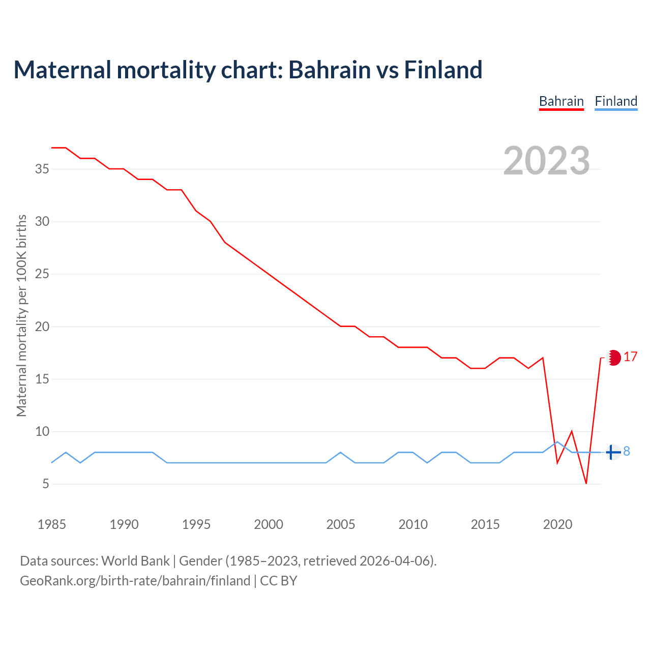 The maternal mortality rate, which is the probability of dying during childbirth or within 42 days of pregnancy termination, is 17 deaths per 100,000 live births in Bahrain, compared to 8 deaths in Finland.