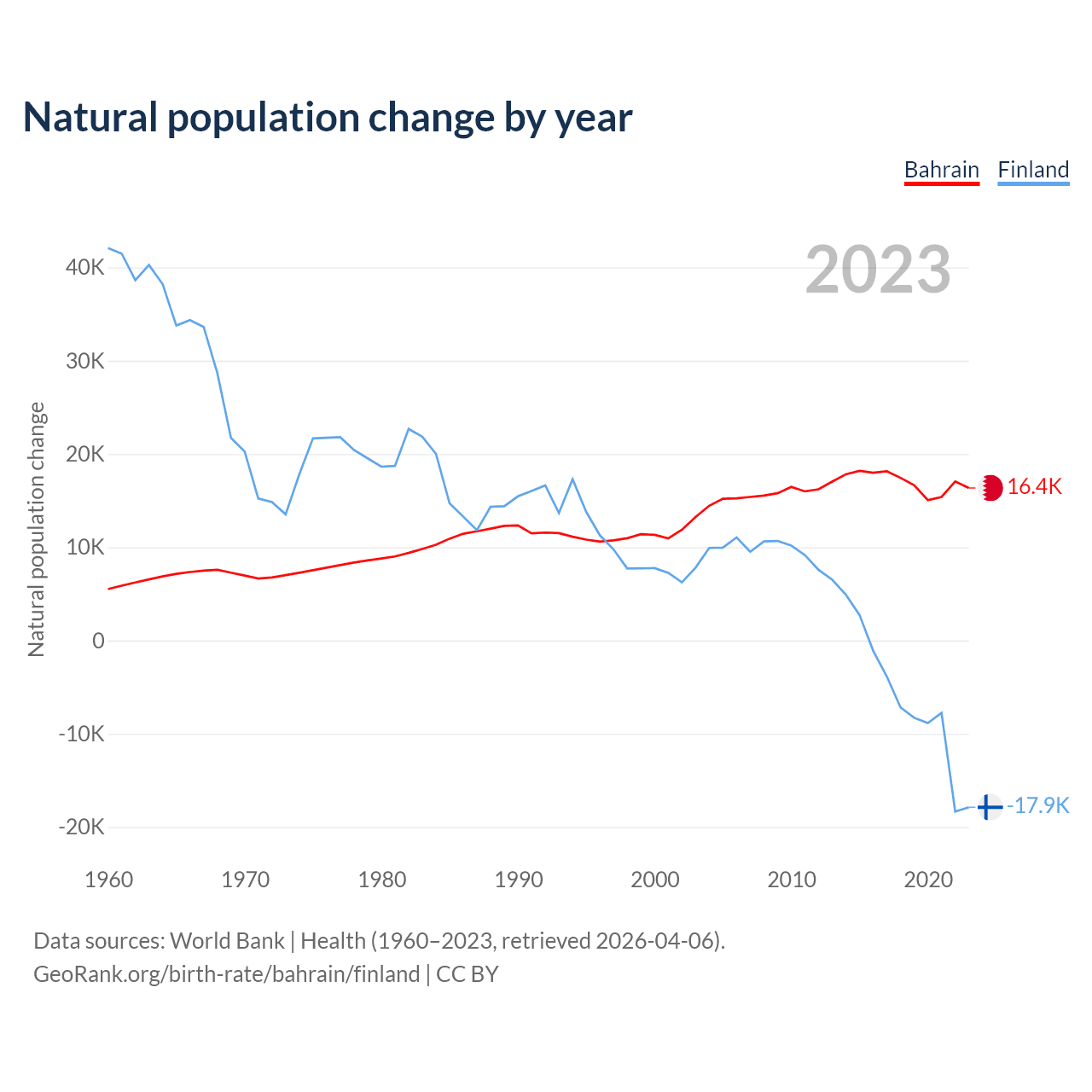 According to the latest available data on birth rates, the fertility rate in Bahrain was 1.82 children per woman in 2023, compared to 1.26 in Finland in 2023. The replacement level is considered to be 2.1 children per woman.