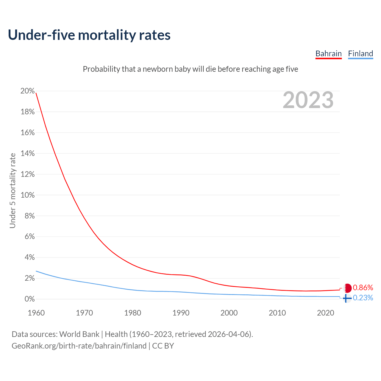 The chance that a newborn baby will die before reaching age five is 0.86% in Bahrain and 0.23% in Finland. Above is a chart with historical data on under-five mortality rates.