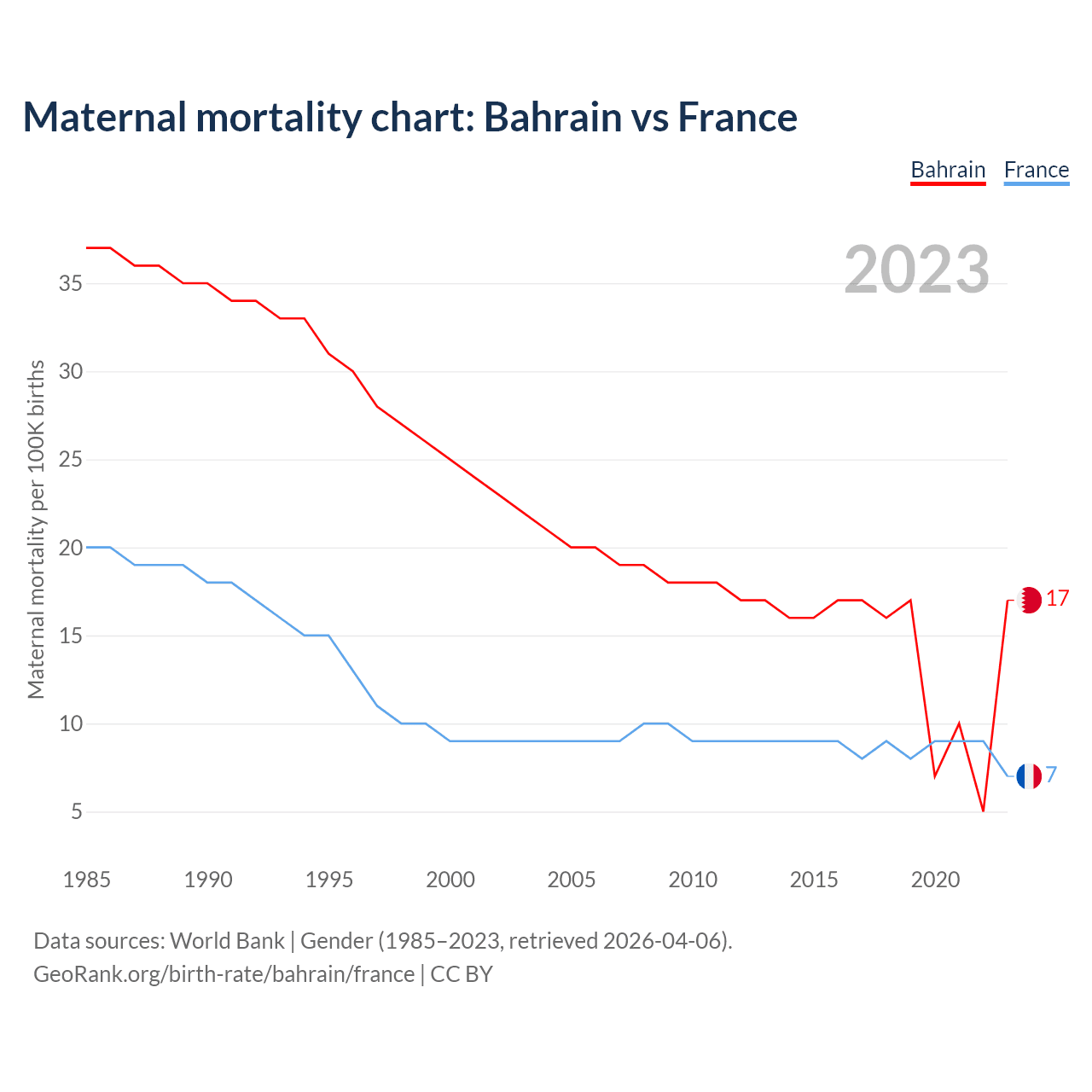 The maternal mortality rate, which is the probability of dying during childbirth or within 42 days of pregnancy termination, is 17 deaths per 100,000 live births in Bahrain, compared to 7 deaths in France.
