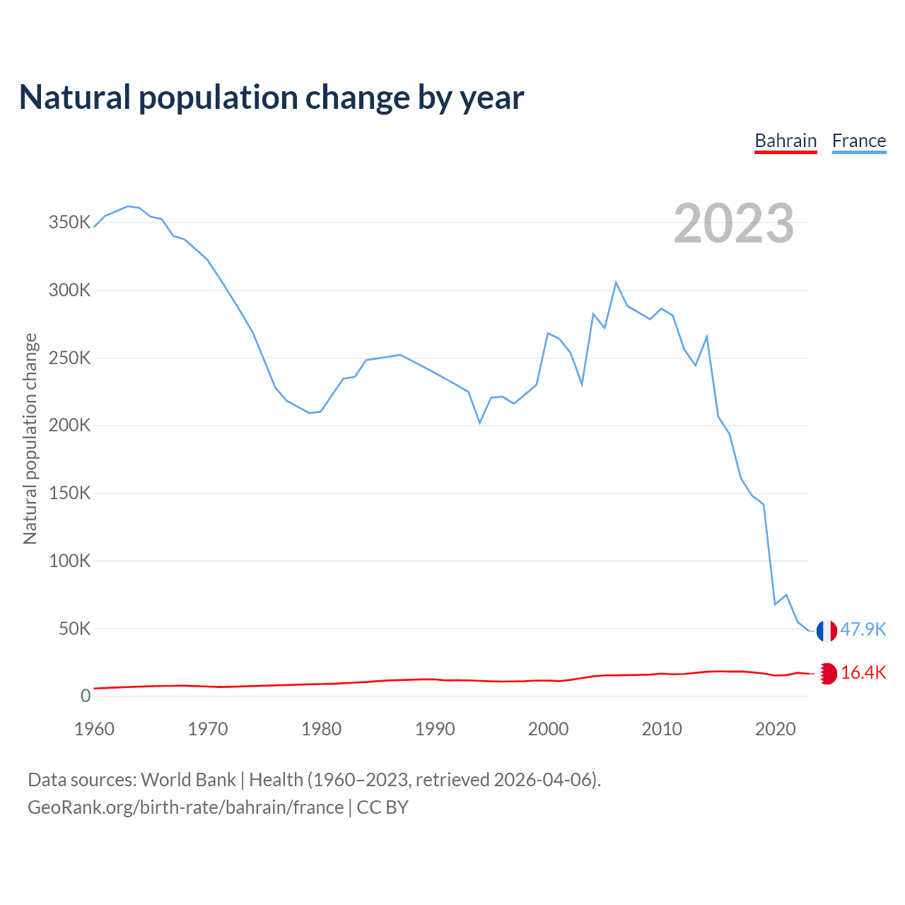 Bahrain has an annual birth rate of 12.5 births per 1,000 people, compared to 9.9 for France. The average number of children a woman is expected to have during her lifetime — the fertility rate, is 1.82 in Bahrain and 1.66 in France — 8.99% difference.