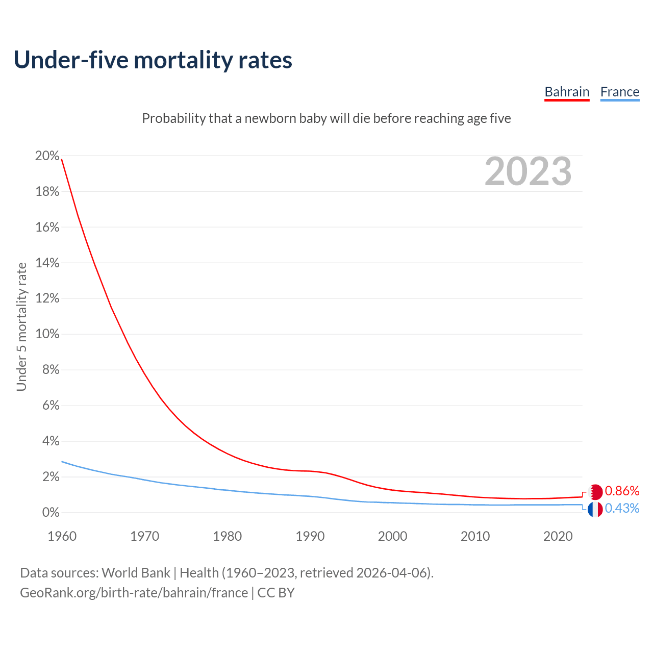 The chance that a newborn baby will die before reaching age five is 0.86% in Bahrain and 0.43% in France. Above is a chart with historical data on under-five mortality rates.