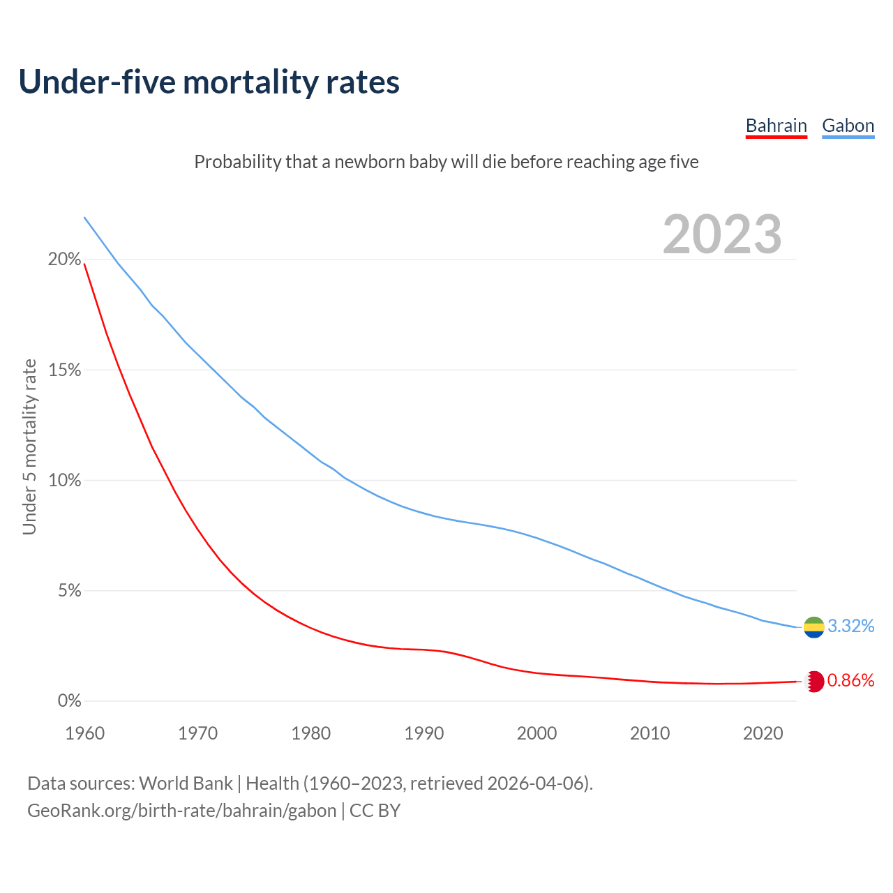 The chance that a newborn baby will die before reaching age five is 0.86% in Bahrain and 3.32% in Gabon. Above is a chart with historical data on under-five mortality rates.