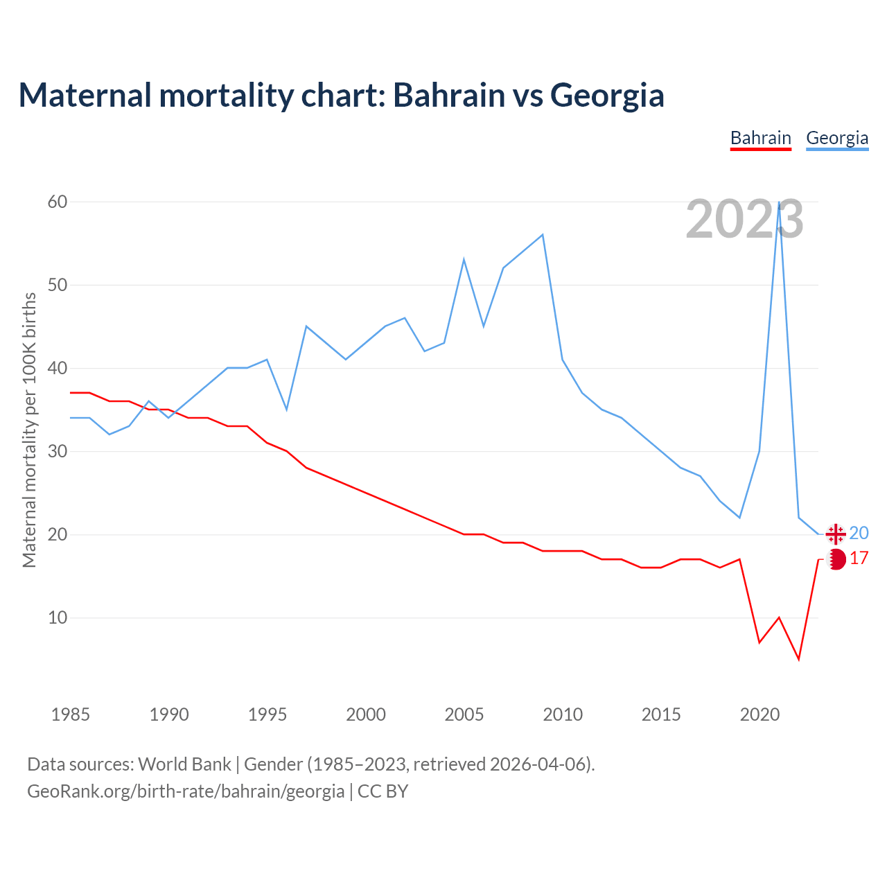 The maternal mortality rate, which is the probability of dying during childbirth or within 42 days of pregnancy termination, is 17 deaths per 100,000 live births in Bahrain, compared to 20 deaths in Georgia.