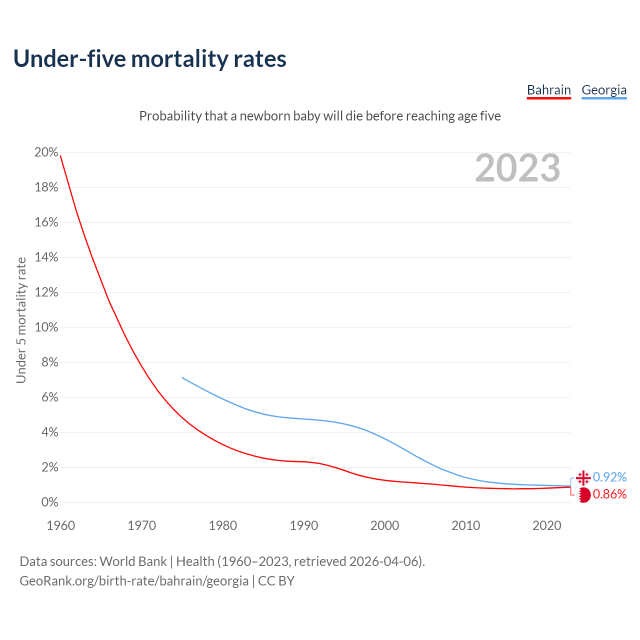 The chance that a newborn baby will die before reaching age five is 0.86% in Bahrain and 0.92% in Georgia. Above is a chart with historical data on under-five mortality rates.