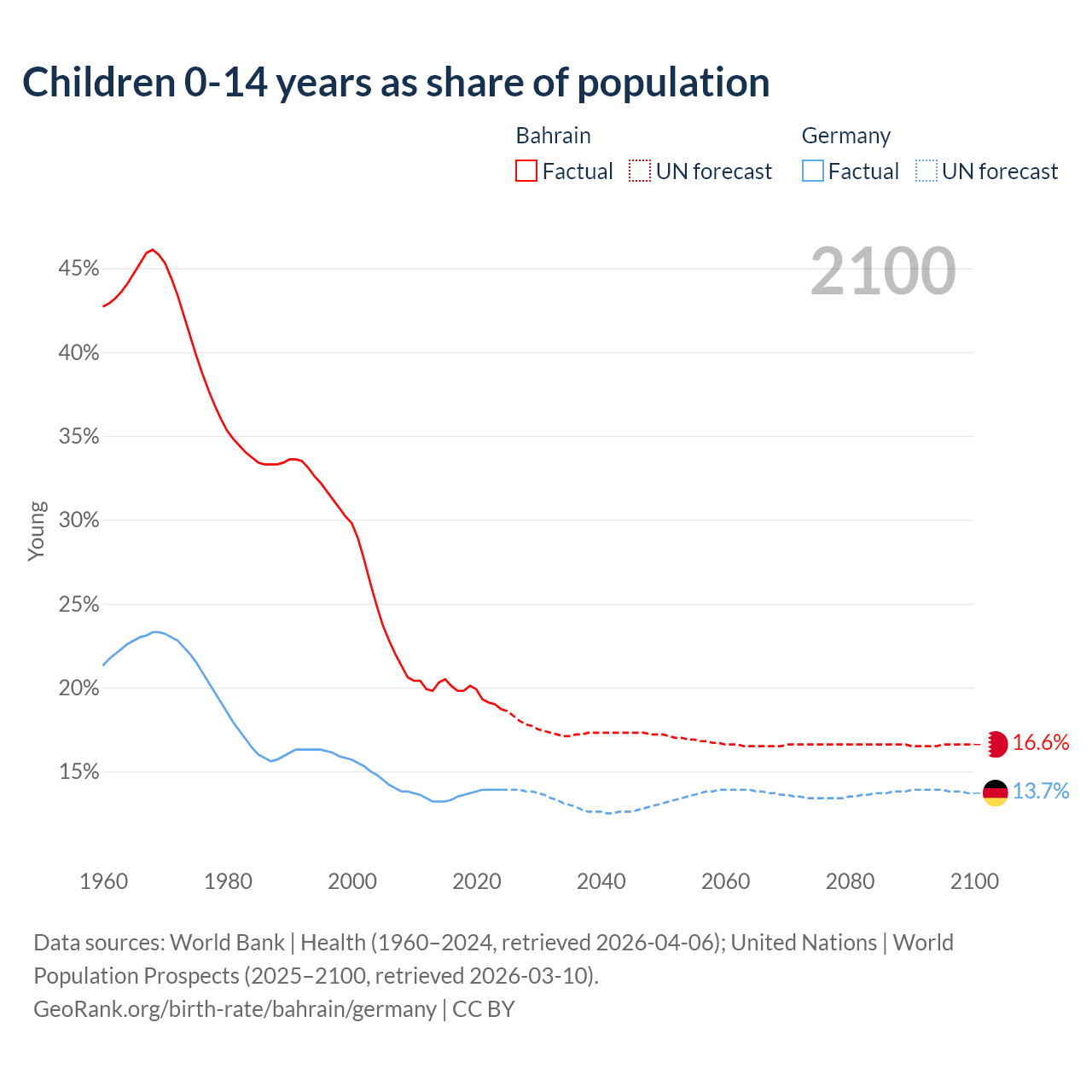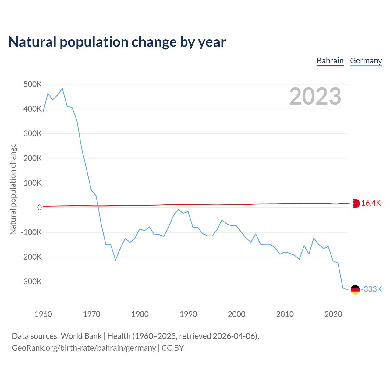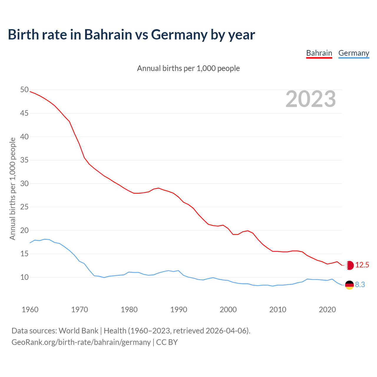 Bahrain has an annual birth rate of 12.5 births per 1,000 people, compared to 8.3 for Germany. The average number of children a woman is expected to have during her lifetime — the fertility rate, is 1.82 in Bahrain and 1.39 in Germany — 23.8% difference.