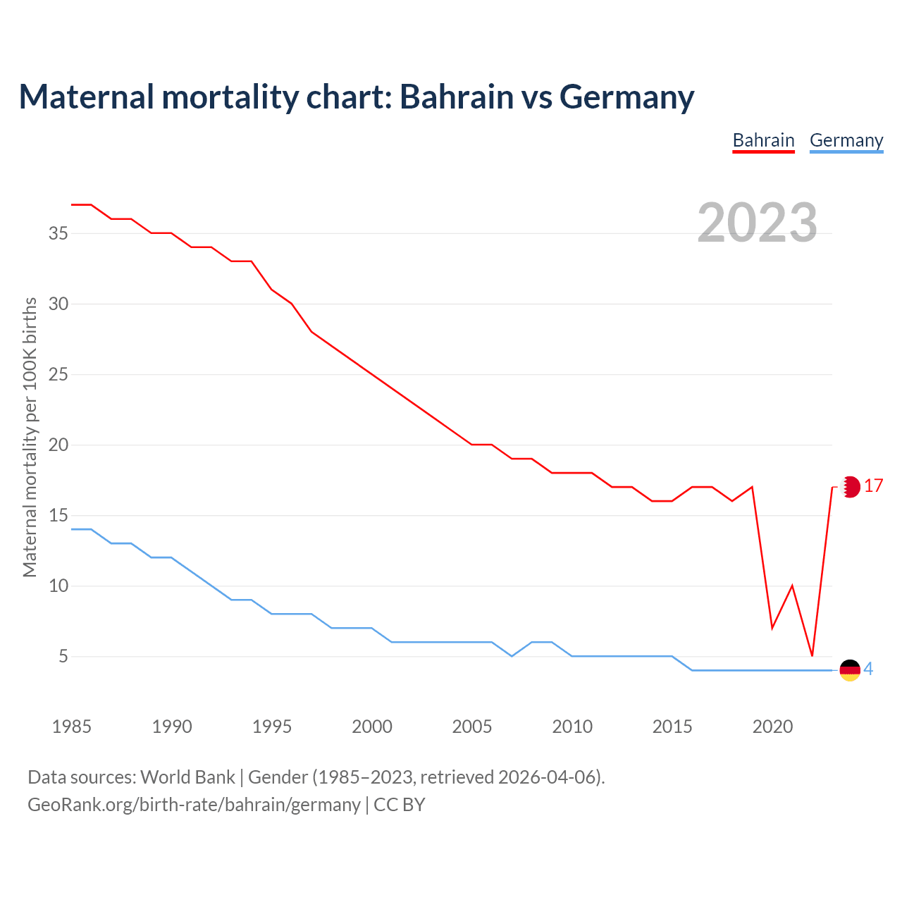 The maternal mortality rate, which is the probability of dying during childbirth or within 42 days of pregnancy termination, is 17 deaths per 100,000 live births in Bahrain, compared to 4 deaths in Germany.
