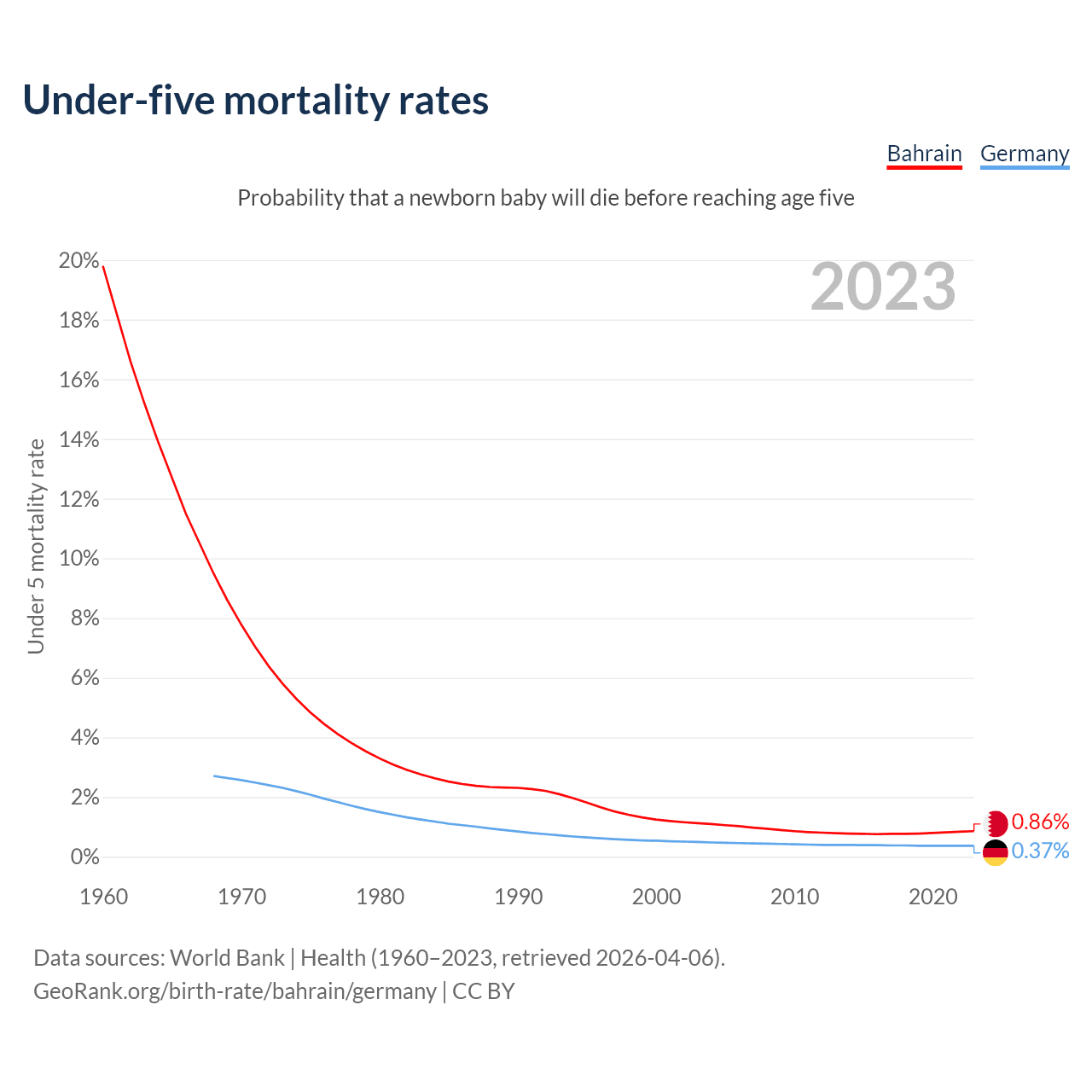 The chance that a newborn baby will die before reaching age five is 0.86% in Bahrain and 0.37% in Germany. Above is a chart with historical data on under-five mortality rates.