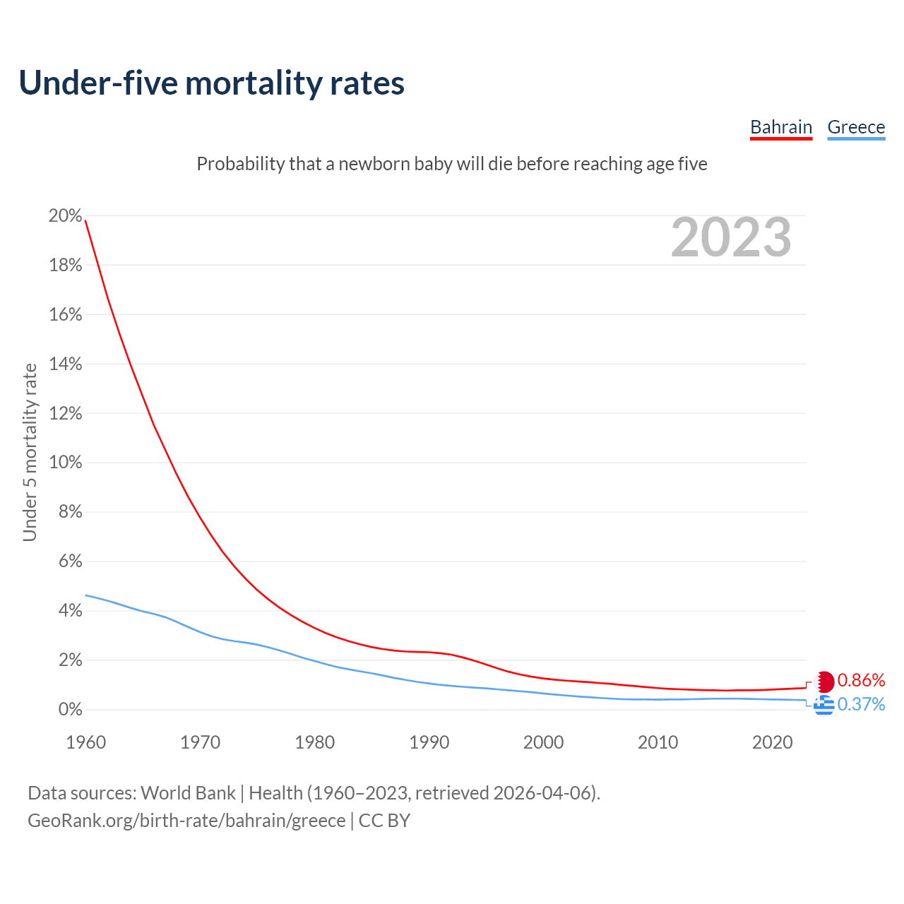 The chance that a newborn baby will die before reaching age five is 0.86% in Bahrain and 0.37% in Greece. Above is a chart with historical data on under-five mortality rates.