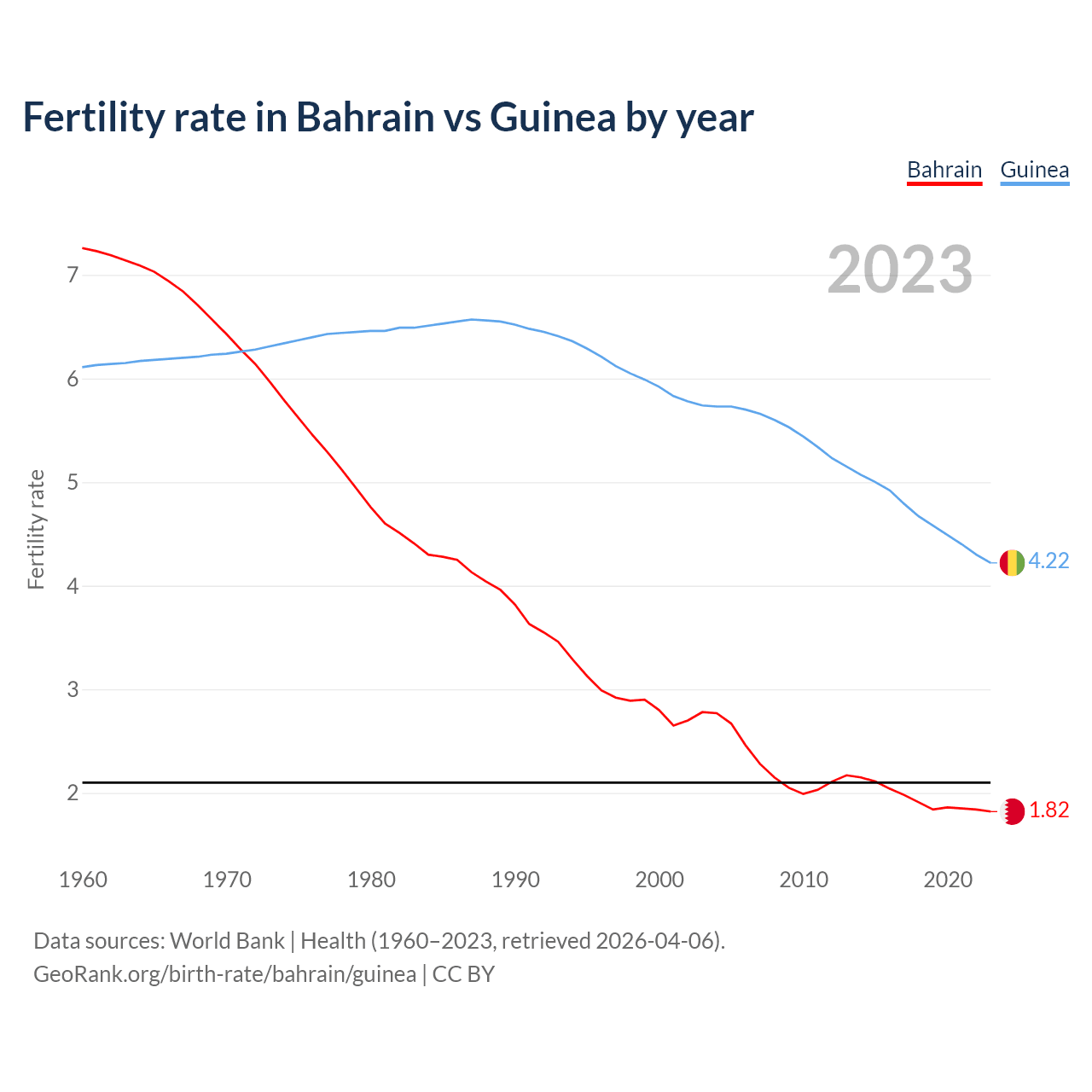 According to the latest available data on birth rates, the fertility rate in Bahrain was 1.82 children per woman in 2023, compared to 4.22 in Guinea in 2023. The replacement level is considered to be 2.1 children per woman.