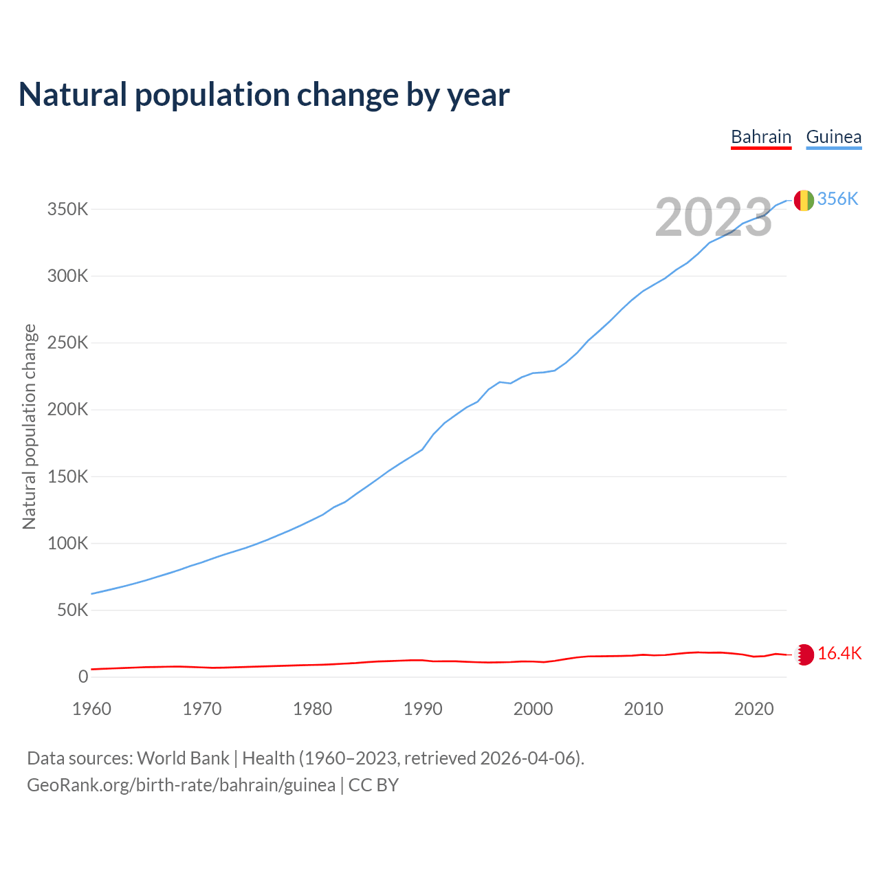 Bahrain has an annual birth rate of 12.5 births per 1,000 people, compared to 33.8 for Guinea. The average number of children a woman is expected to have during her lifetime — the fertility rate, is 1.82 in Bahrain and 4.22 in Guinea — 131.2% difference.