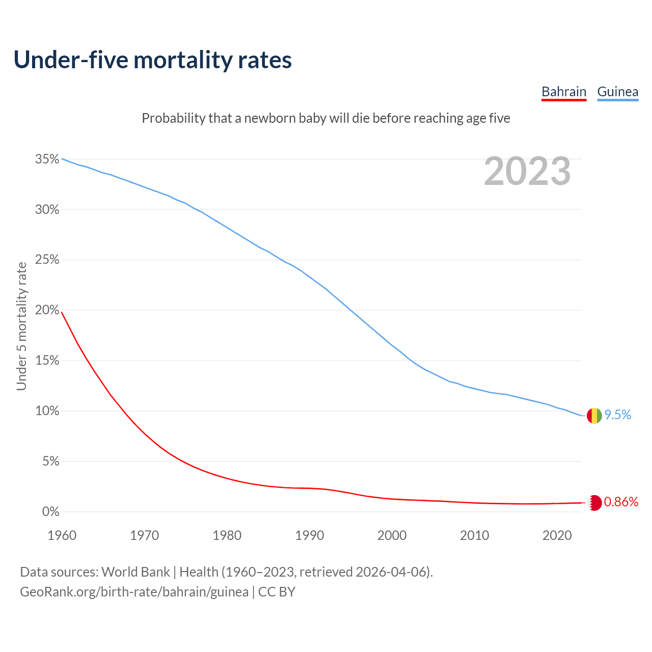 The chance that a newborn baby will die before reaching age five is 0.86% in Bahrain and 9.5% in Guinea. Above is a chart with historical data on under-five mortality rates.